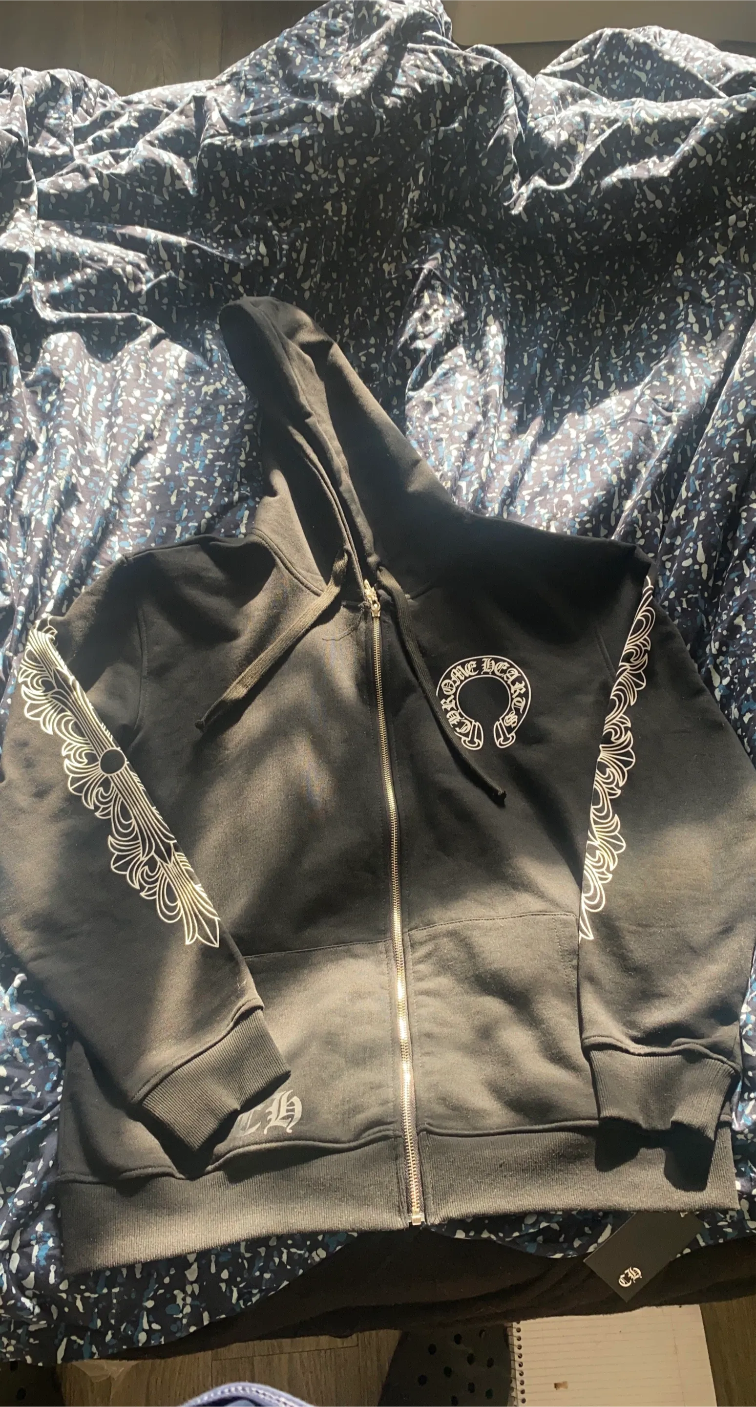 Black zip-up hoodie with Chrome Hearts logo on the back and sleeve detailing. Features a full zip closure and hood. Cotton blend material.