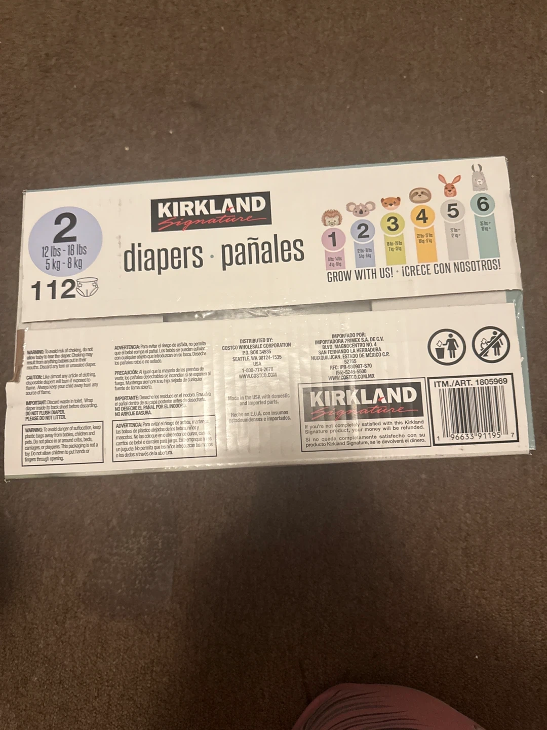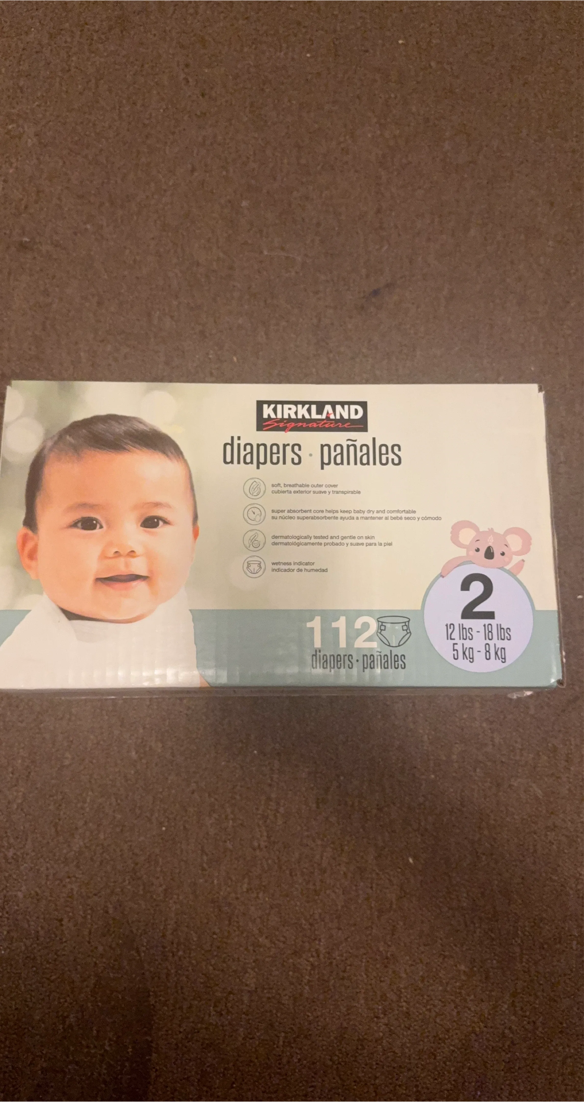Kirkland Signature diapers, size 2. This pack includes 112 diapers. They are designed for babies weighing 12-18 lbs (5-8 kg). Dermatologically tested and gentle on skin.