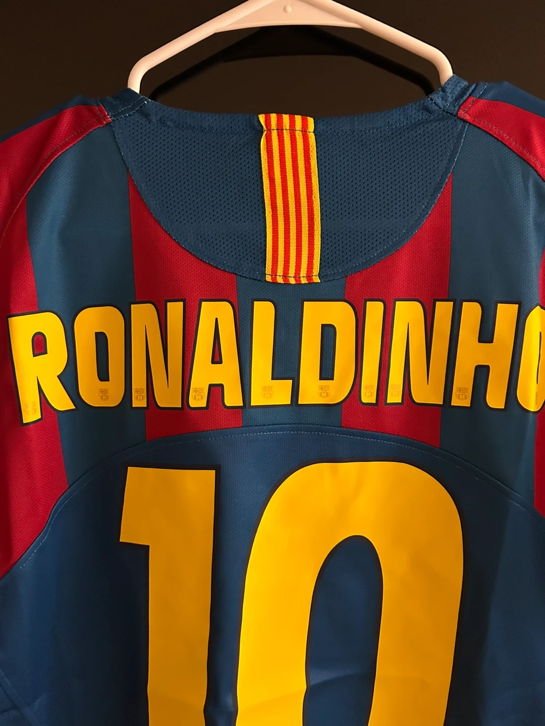 Authentic FC Barcelona jersey featuring Ronaldinho's name and number 10. This Nike shirt is made with breathable fabric. It's a must-have for any Barcelona fan!
