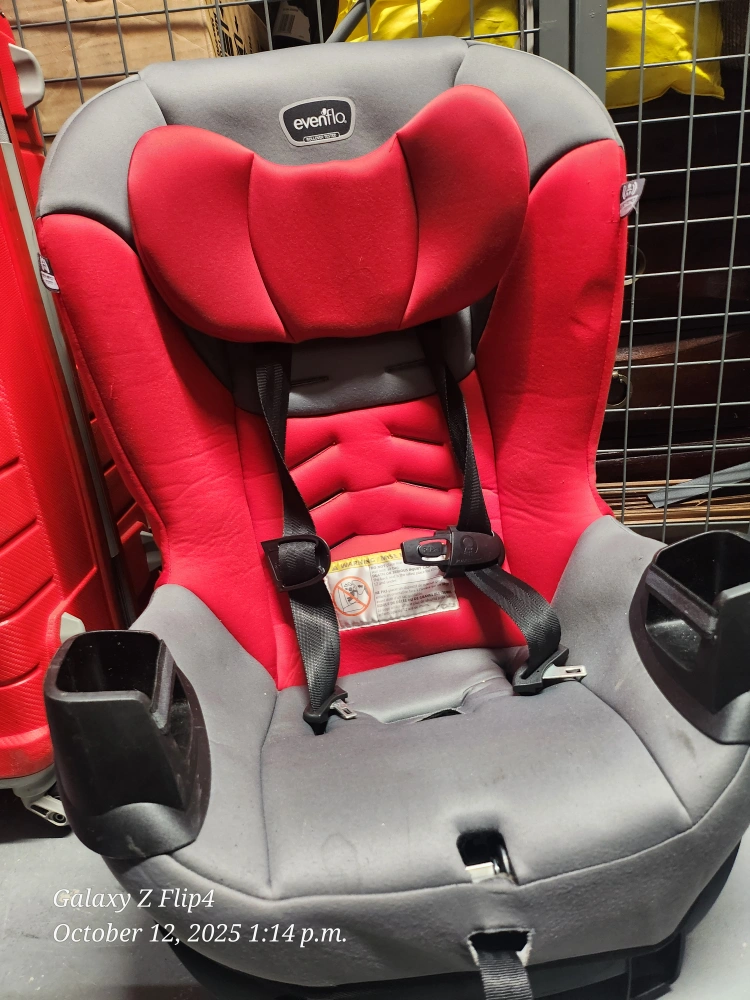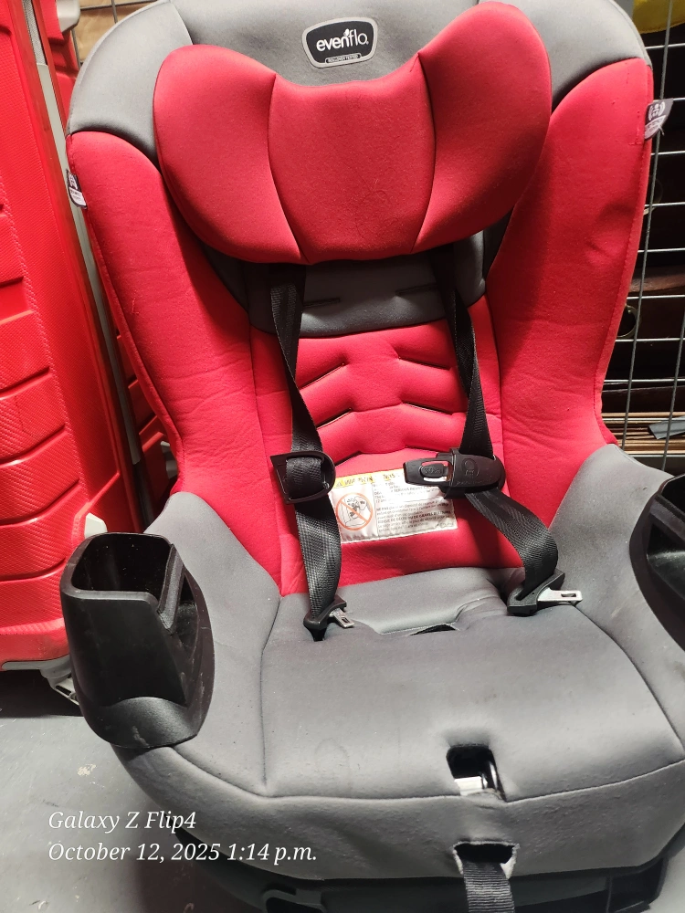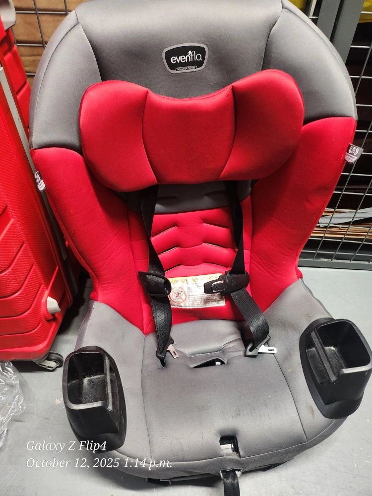 Selling an Evenflo car seat in a red and grey colour scheme. It's in good condition and ready for a new home. Perfect for keeping your little one safe and comfy on the road!