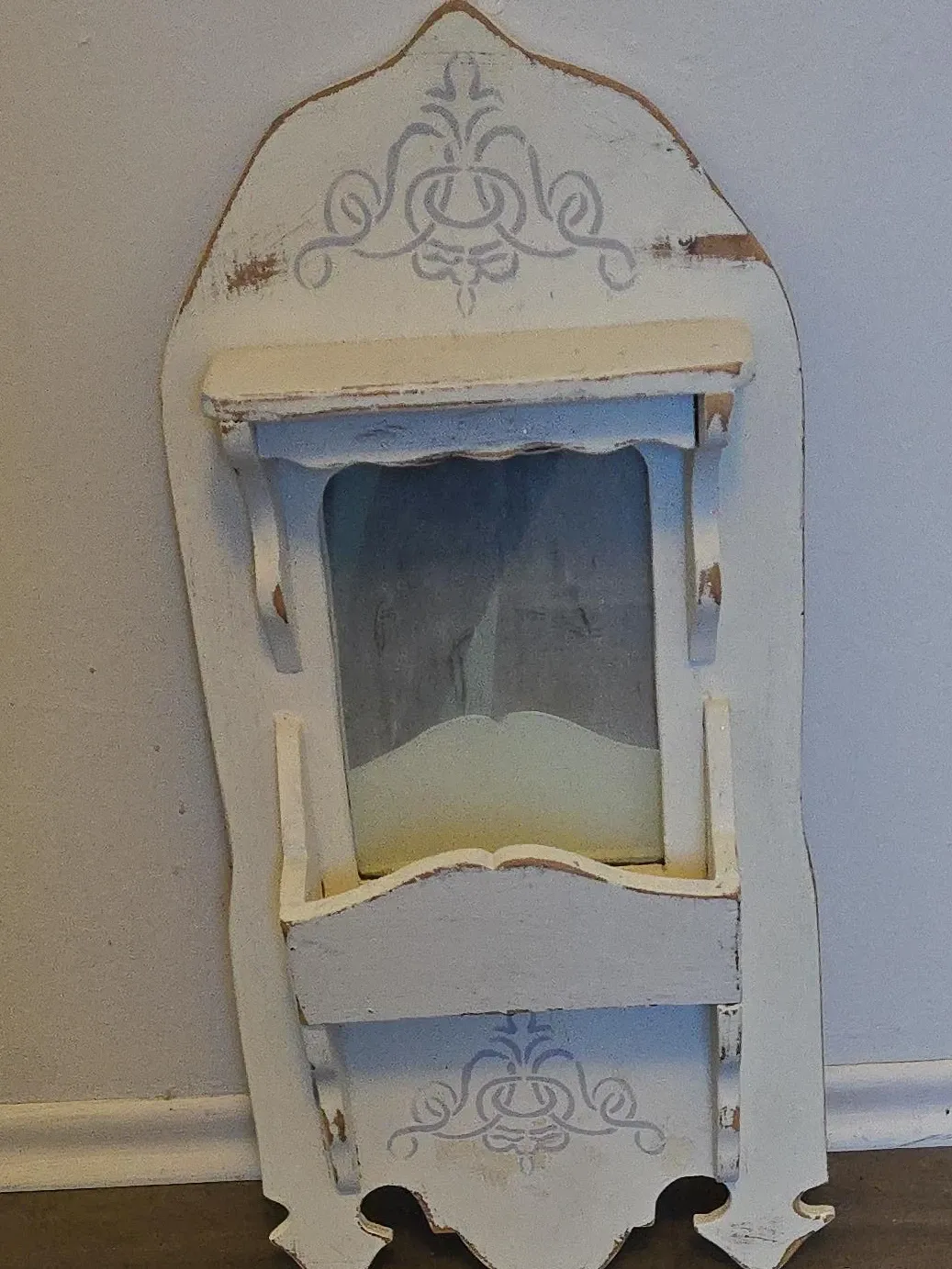 This is a charming vintage wall shelf, complete with a small mirror. It's painted in a lovely white colour and features decorative detailing. Perfect for adding a touch of rustic charm to any room!
