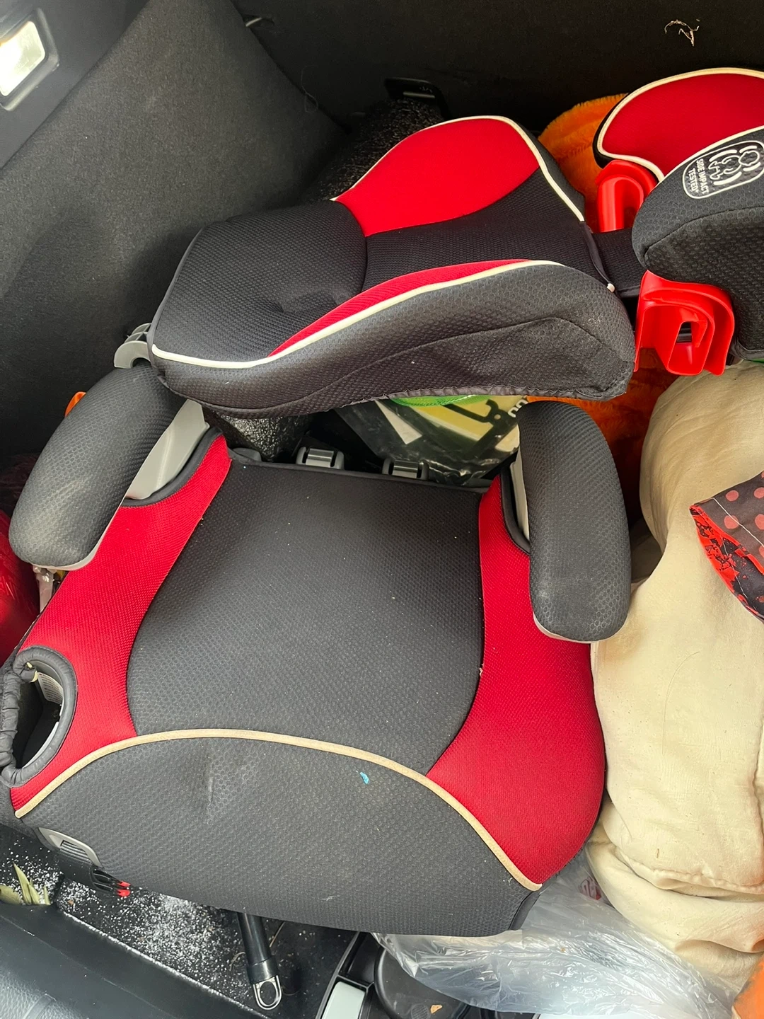 Graco booster car seat in red and black. Converts from high-back to backless booster. It has adjustable headrest and padded armrests. Great for children transitioning to a regular seat.