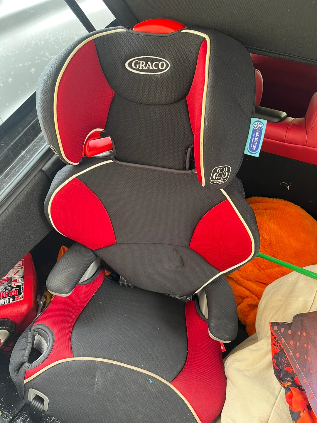 Graco booster car seat in red and black. Converts from high-back to backless booster. It has adjustable headrest and padded armrests. Great for children transitioning to a regular seat.
