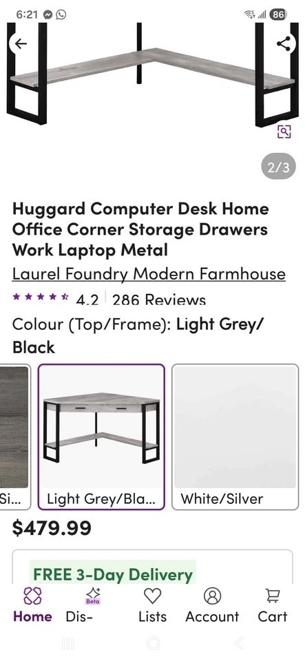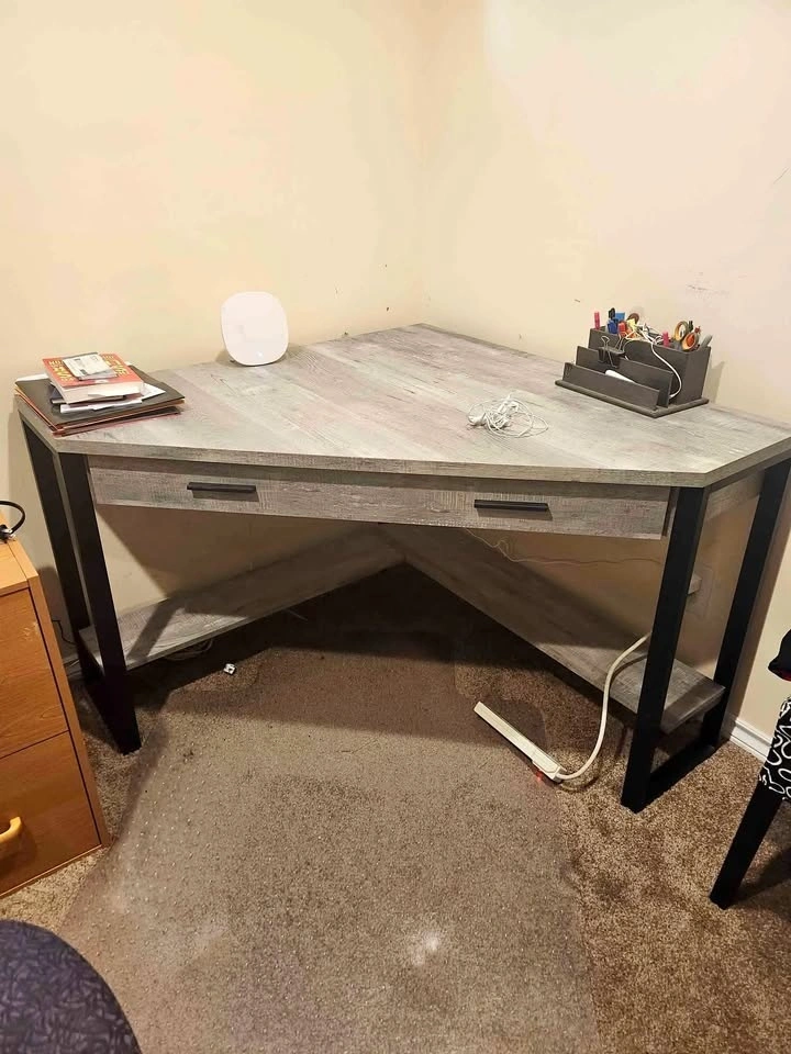 Large solid corner desk I bought from Wayfair a few years back. It fit into my apartment and could hold 2 monitors, a laptop, keyboard, and mouse pad with room to spare. Desk measurements are in the pictures.