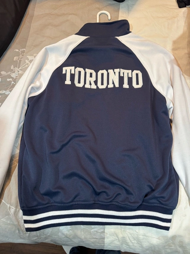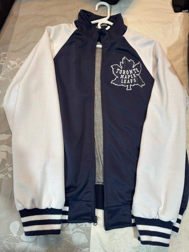 Show your team spirit with this Toronto Maple Leafs jacket, perfect for any fan! This jacket is in new condition, worn once. It's a size large and features the classic Leafs logo. I'm parting ways with it to declutter my closet and pass it on to another fan. Size: Large, Team: Toronto Maple Leafs, Colour: Blue and White. If the ad is up, it's still available.