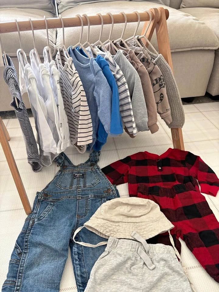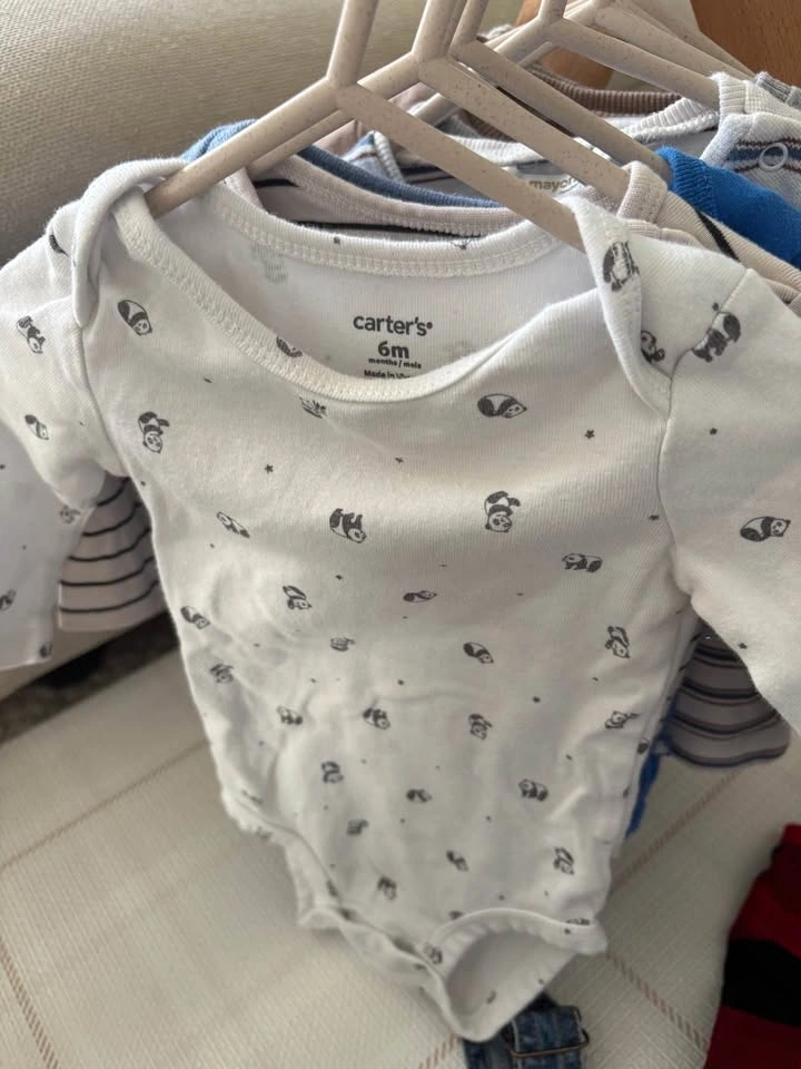 4-6M and 6M baby bundle of 17 items - (t-shirt onesies, long-sleeve onesies, long sleeves shirts, sweaters, linen hat, overalls, PJs and shorts). Mix of brands including Mayoral, H&M, Noppies, OshKosh, Canadiana, BabyGap and George, etc.).