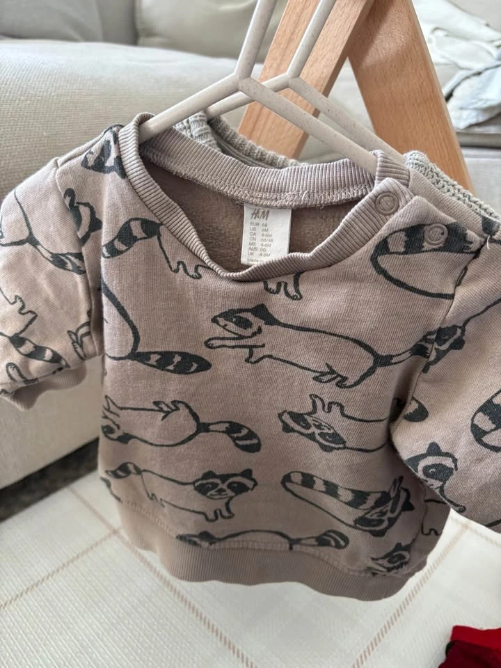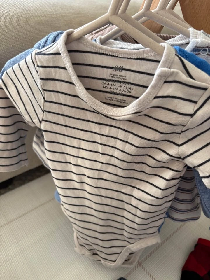4-6M and 6M baby bundle of 17 items - (t-shirt onesies, long-sleeve onesies, long sleeves shirts, sweaters, linen hat, overalls, PJs and shorts). Mix of brands including Mayoral, H&M, Noppies, OshKosh, Canadiana, BabyGap and George, etc.).