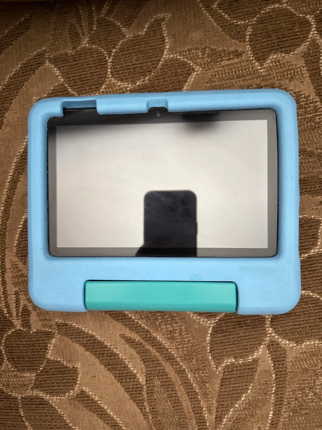 Tablet in a light blue protective case. Features a screen, and a camera. The case has a handle and appears to be made of a soft material. You can use this tablet to relax by reading a book.