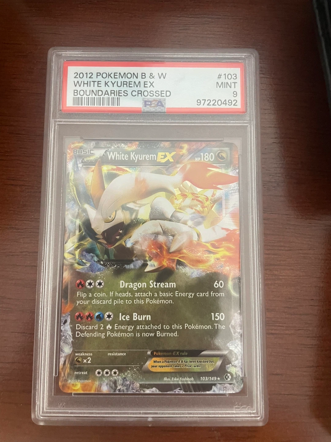 Selling a 2012 Pokemon B & W White Kyurem EX Boundaries Crossed card. It's a PSA Mint 9, #103 and has the serial number 97220492
