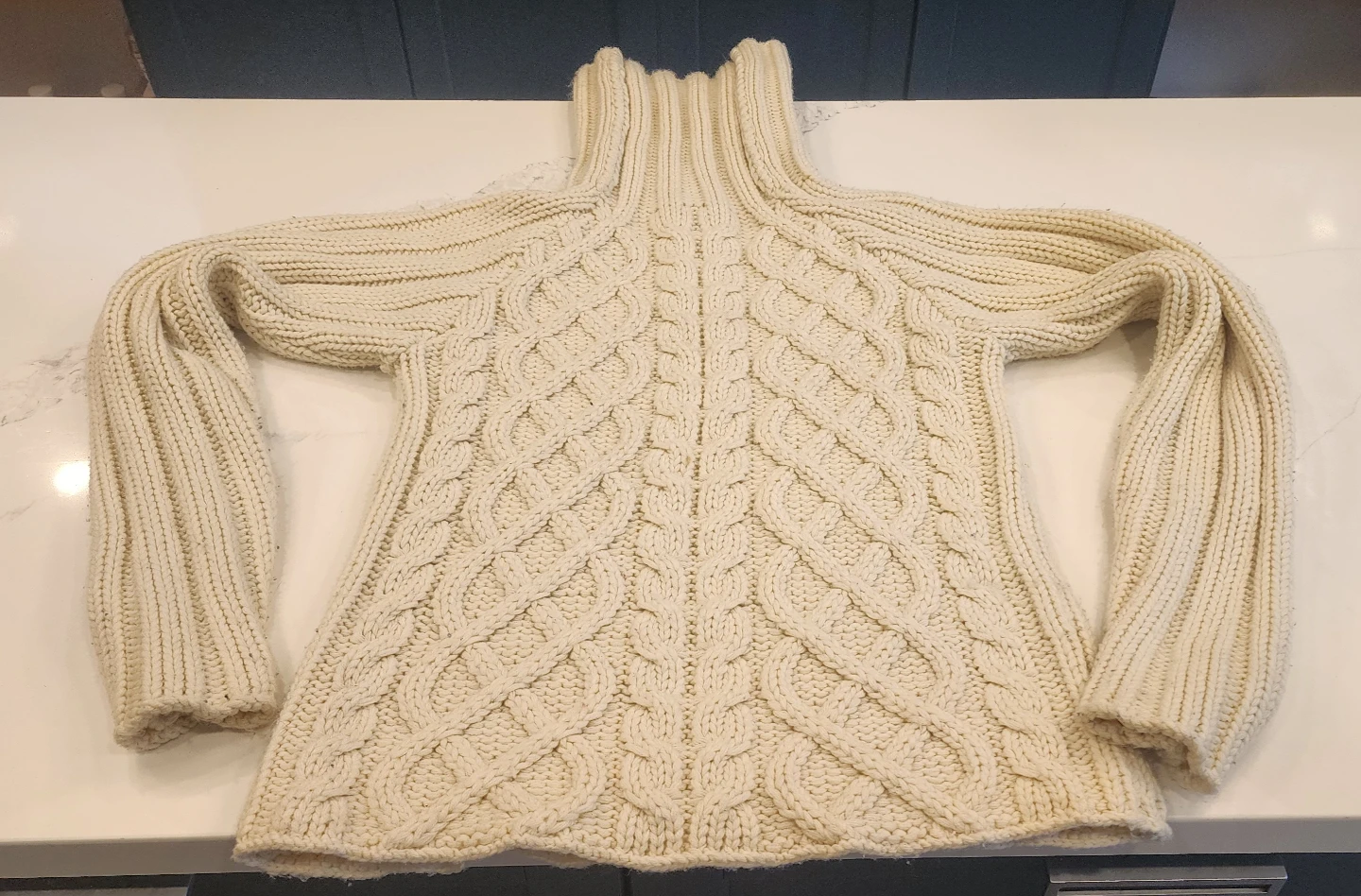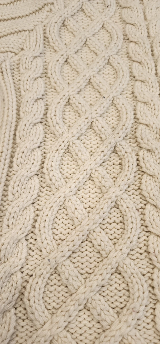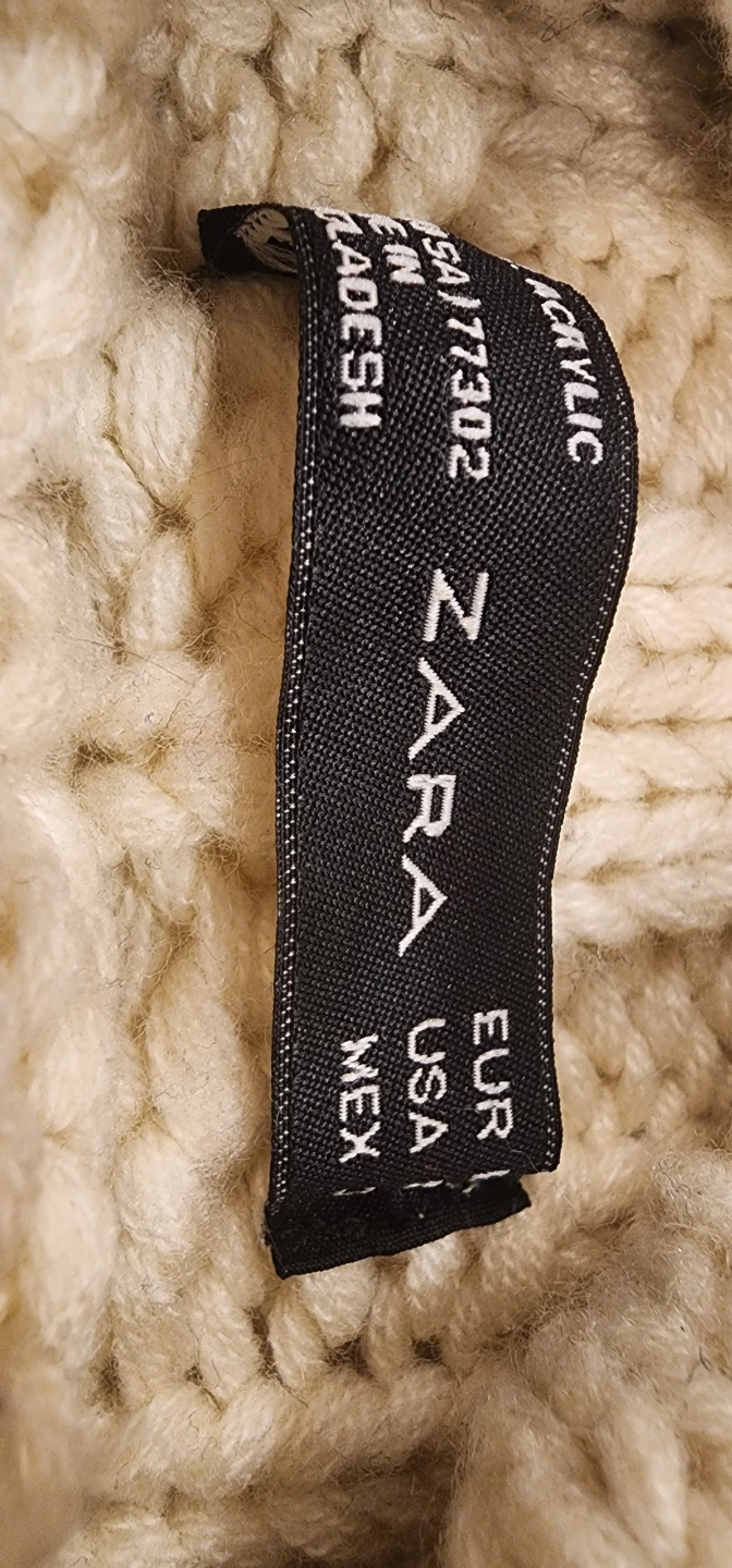 Cream cable knit turtleneck sweater from Zara. It's a size large with long sleeves and a classic cable knit pattern. Made from an acrylic blend. Cozy and stylish for cooler weather!