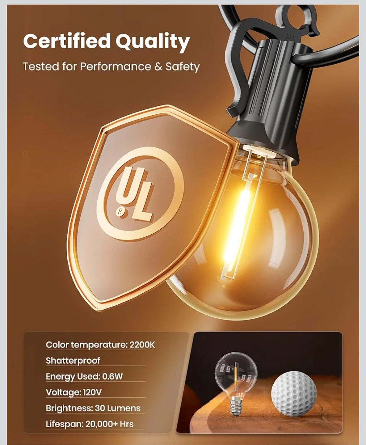 These UL certified string lights boast shatterproof bulbs and commercial-grade wire for durability. They're dimmable and feature a warm 2200K color temperature. Built for all-weather resistance, including waterproof, heat, frost, and windproof capabilities!