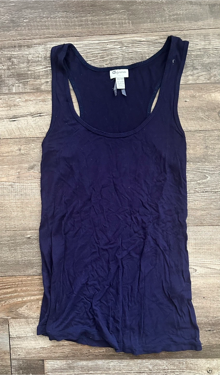 This is a Dynamite navy blue racerback tank top. It's made from a soft, stretchy fabric. This tank is perfect for layering or wearing on its own during warmer weather!