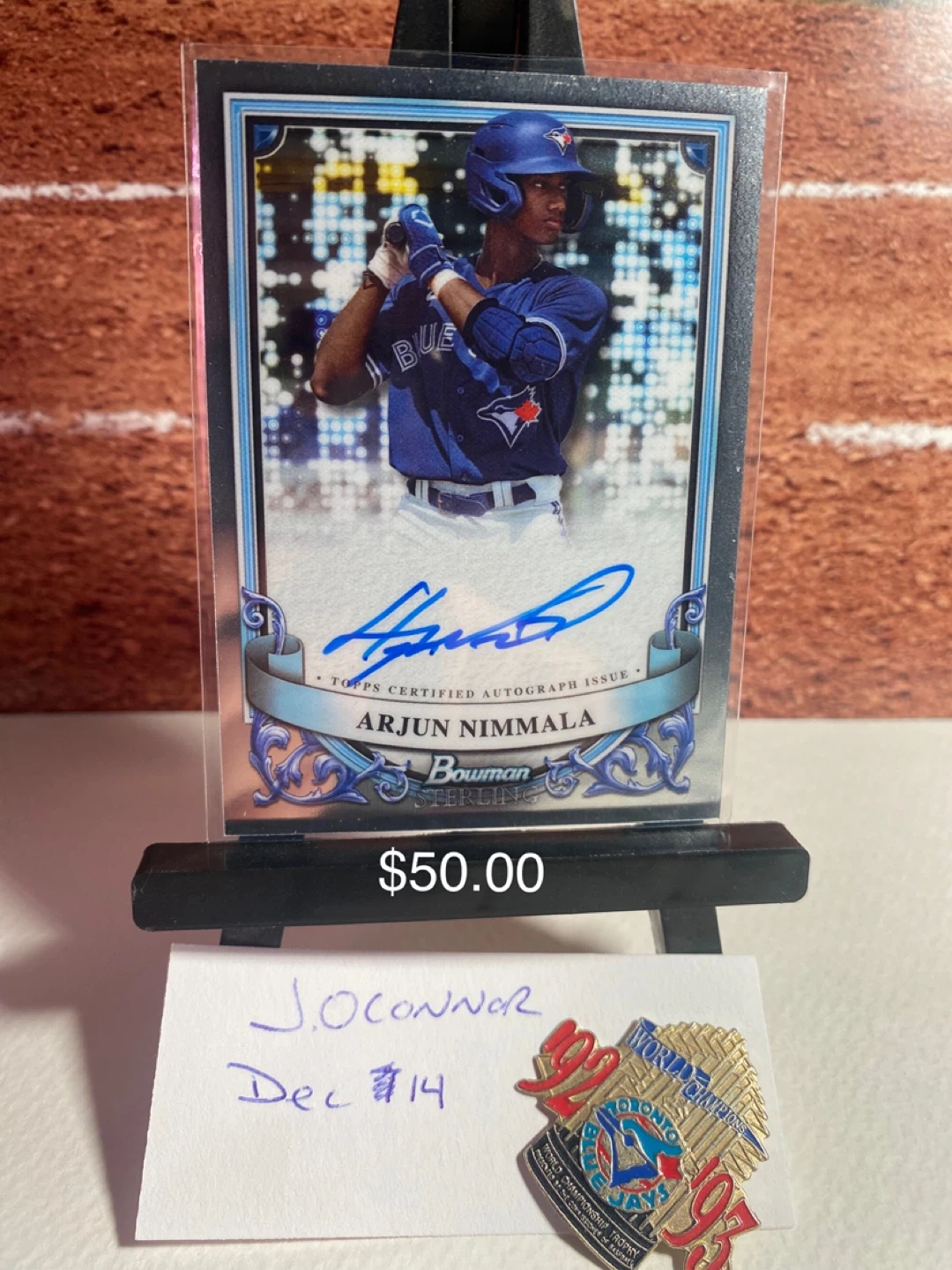 Selling an Arjun Nimmala autographed baseball card. It's a Topps certified autograph issue from Bowman Sterling. Asking $50