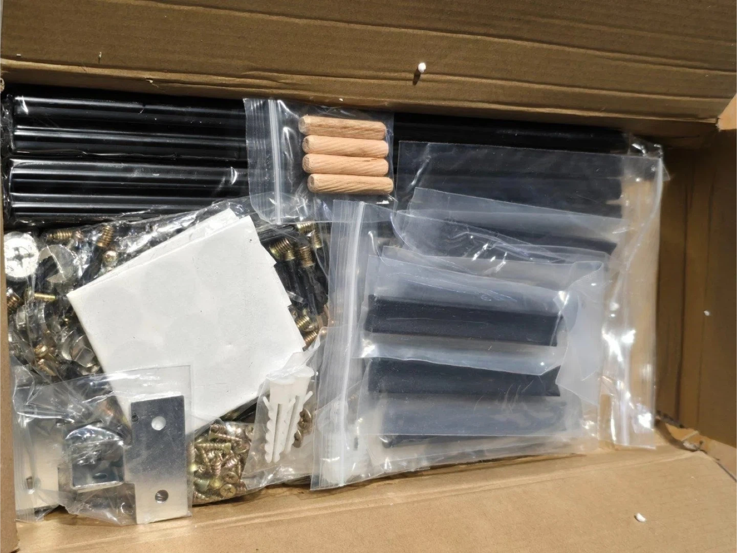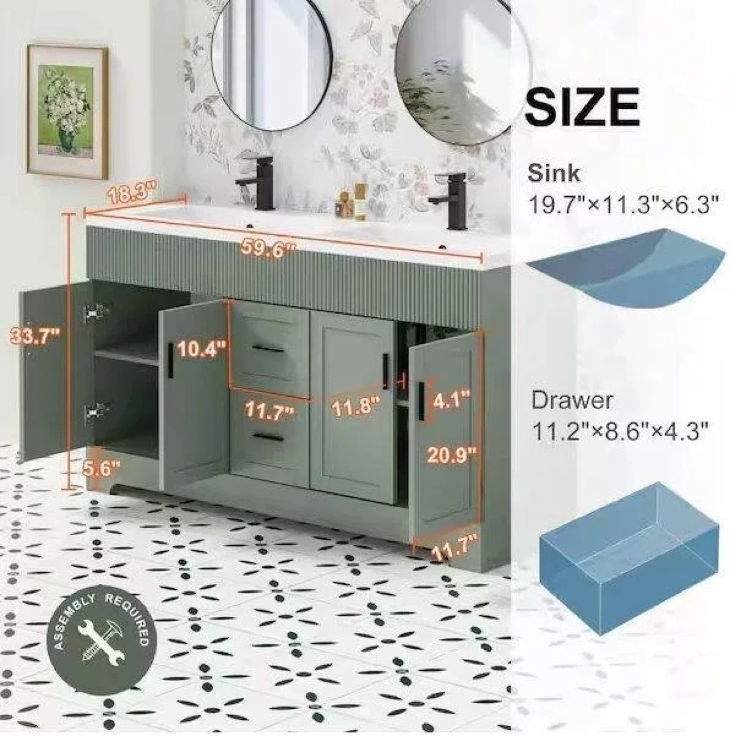 This vanity measures 59.6 inches wide, 33.7 inches high, and 17.7 inches deep. It doesn’t include top and ample storage with multiple cabinets and a drawer. Assembly is required.