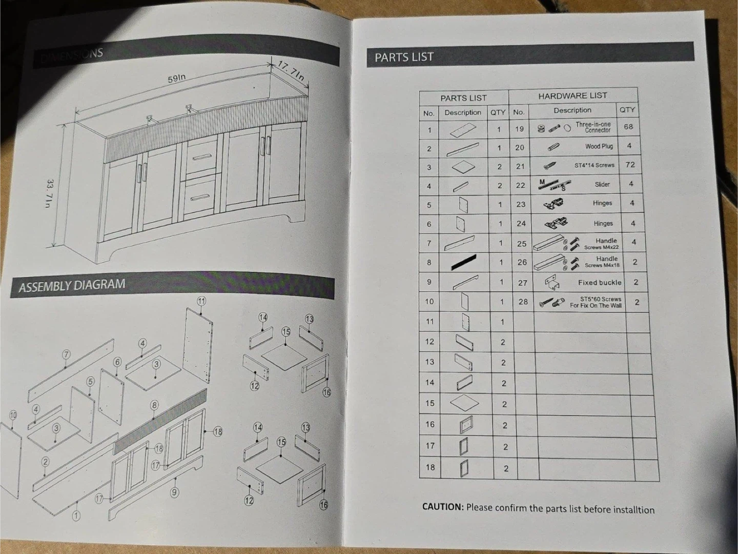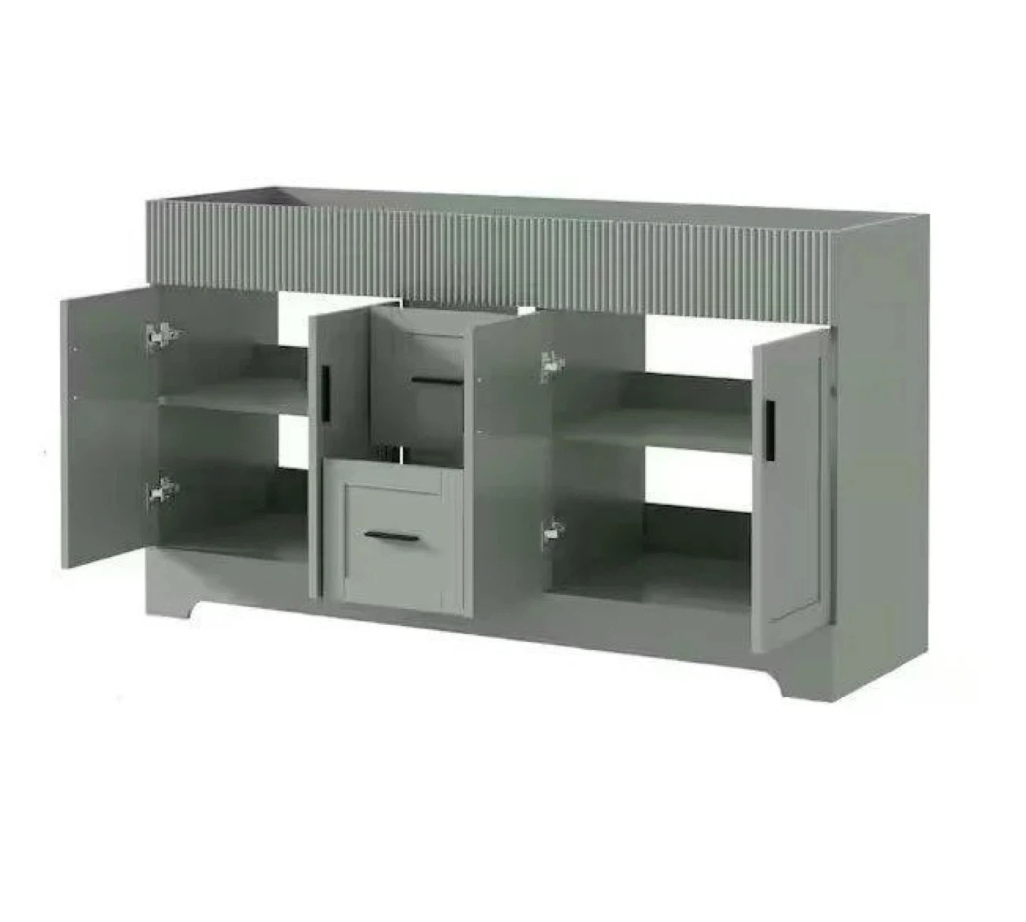 This vanity measures 59.6 inches wide, 33.7 inches high, and 17.7 inches deep. It doesn’t include top and ample storage with multiple cabinets and a drawer. Assembly is required.