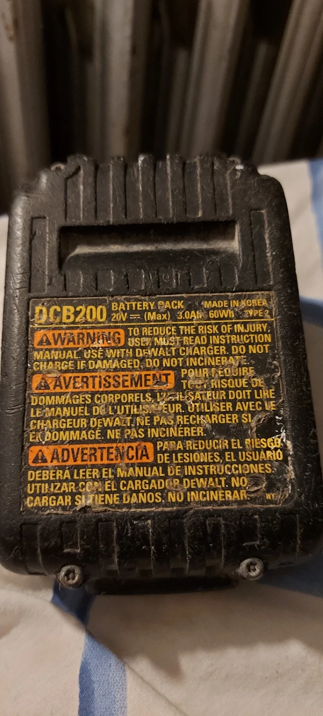 DeWalt DCB200 battery pack. It's a 20V MAX Lithium Ion model with a 3.0Ah capacity and 60Wh rating. Made in Korea.