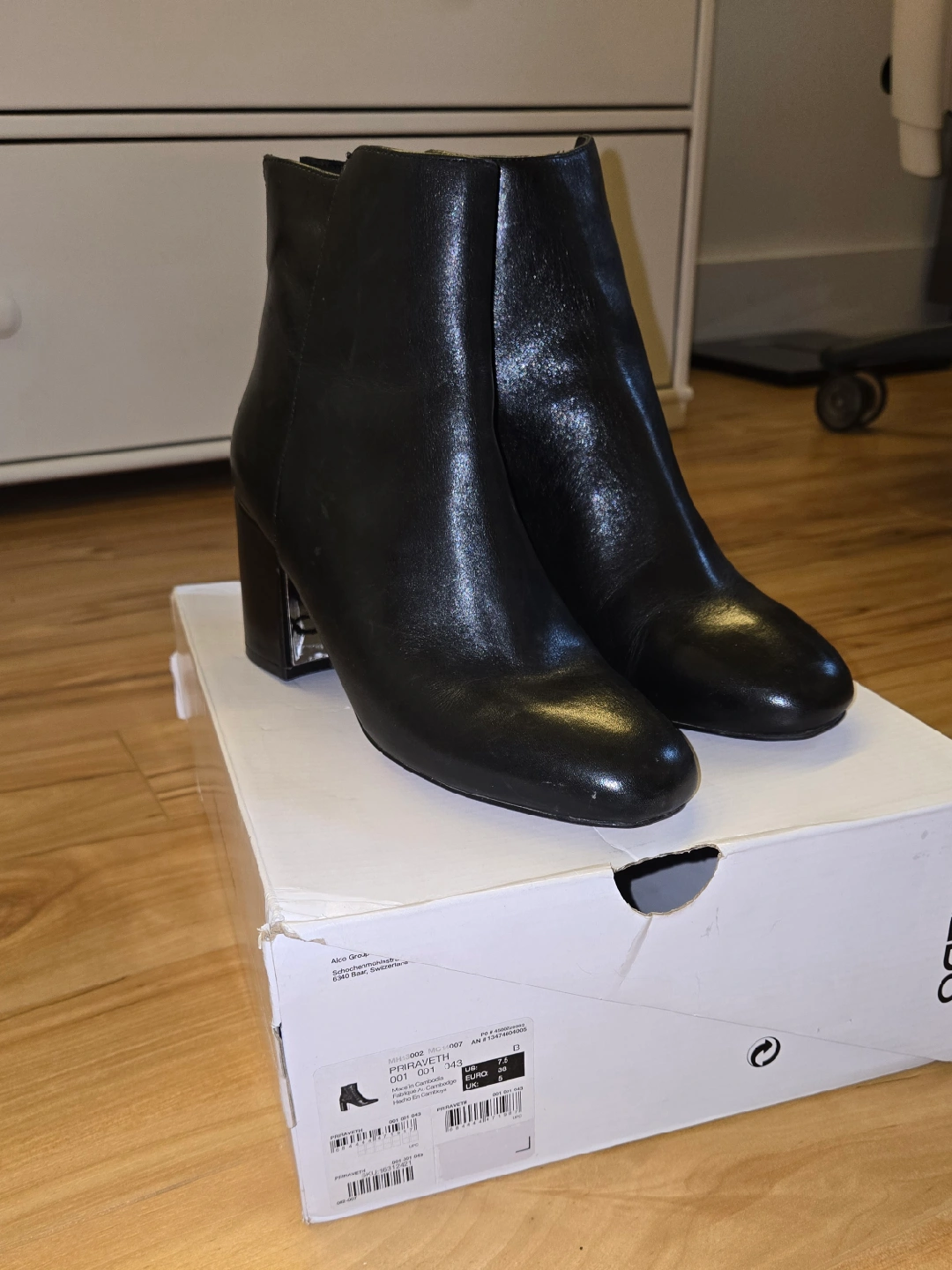 These are a pair of black leather ankle boots from Aldo. They are a size 7.5. The boots are in great condition and come with the original box. Original price $140