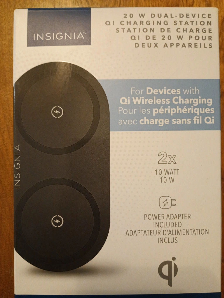 Selling a brand new Insignia 20W Dual-Device Qi Charging Station! It's perfect for charging two devices at once, with two 10W charging zones. The compact design is ideal for your nightstand, desk, or travel. Includes the power adapter and quick setup guide. Wirelessly charges most Qi-enabled devices, including Apple and Samsung devices. Get rid of those cumbersome cords!