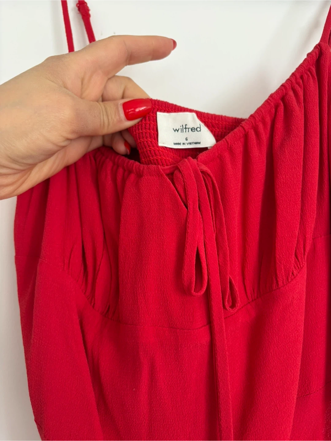 This is a Wilfred red spaghetti strap maxi dress. It features a tie-front detail and smocking at the bust. This dress is perfect for a night out or a special occasion!