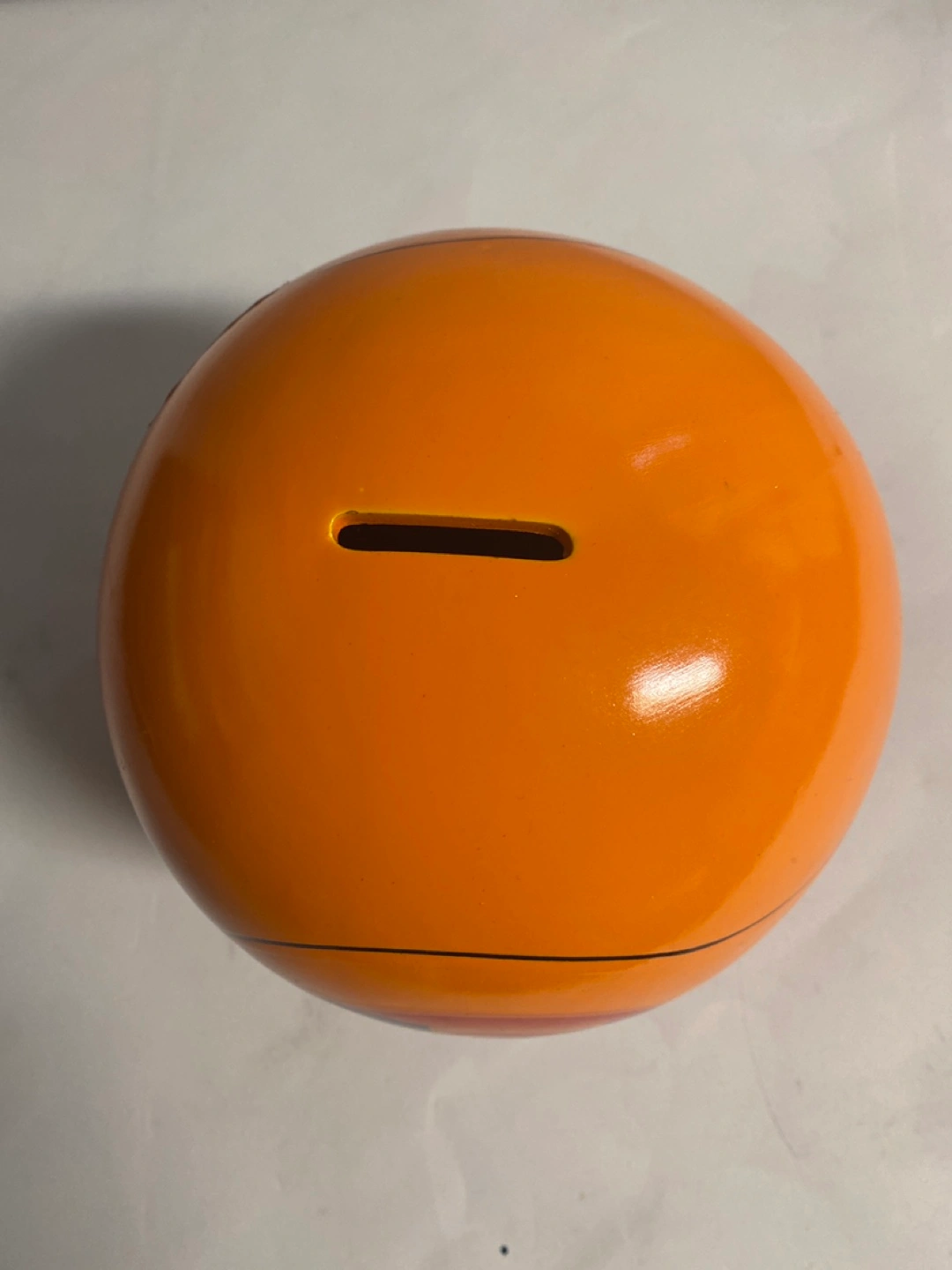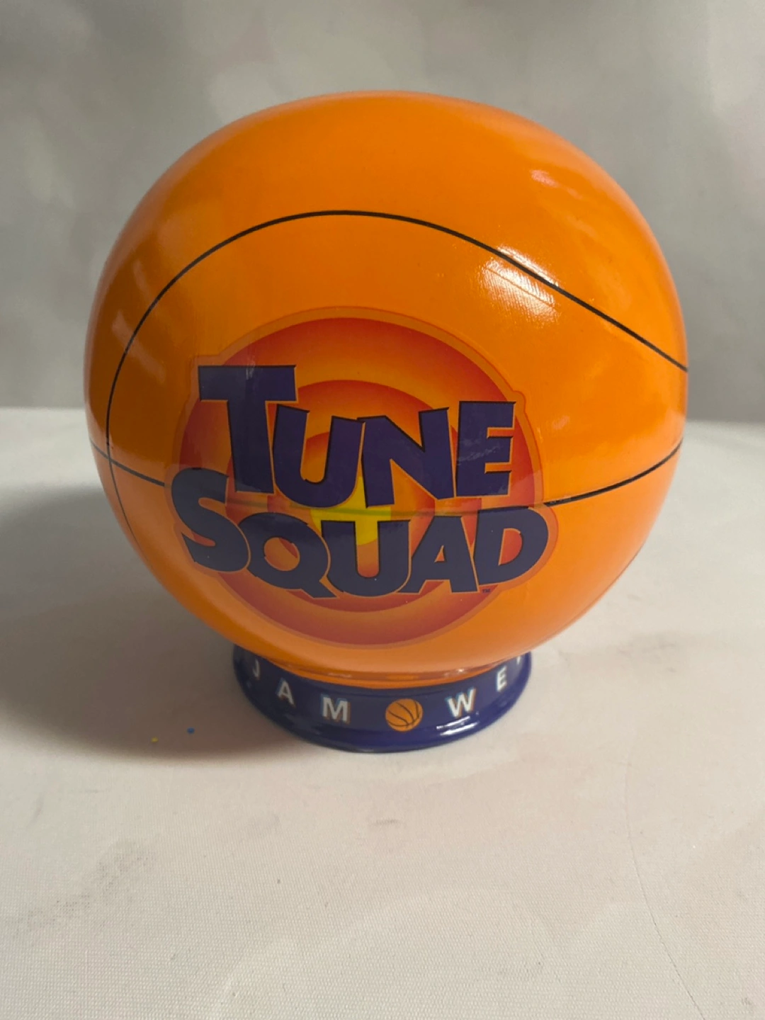 Collectible piggy bank shaped like a basketball. Features Tune Squad characters and logo. Orange and purple colour scheme. Has a small slot on top for coins.