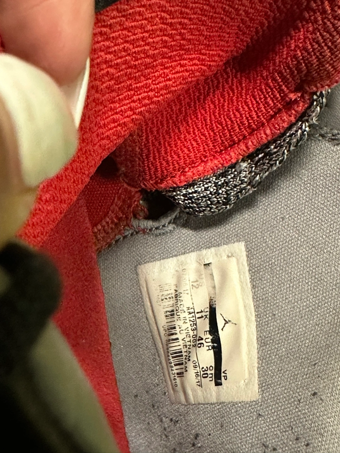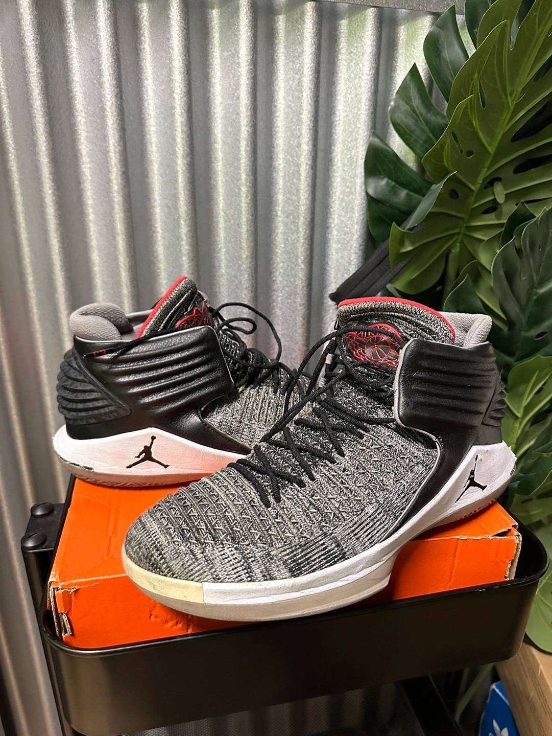 Pre-owned Air Jordan XXXII basketball shoes. Grey, black and red colour scheme. Size 12 . Show some wear. See pictures for details.