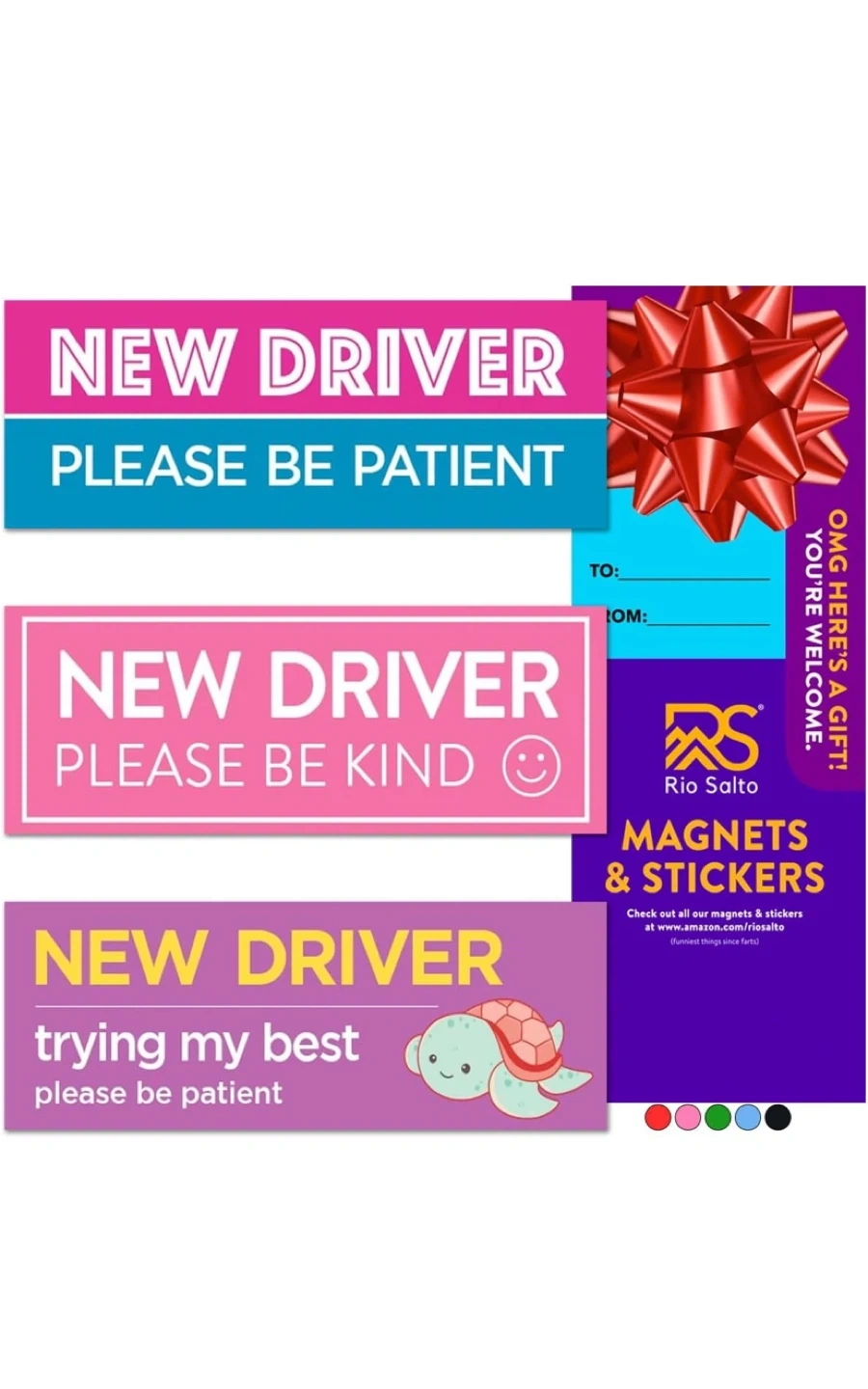 Selling a new 4-pack of Rio Salto magnets and stickers. These are perfect for new drivers and designed to encourage patience and kindness from other drivers on the road. They help reduce anxiety behind the wheel by giving other drivers more patience and reducing tailgating and honking