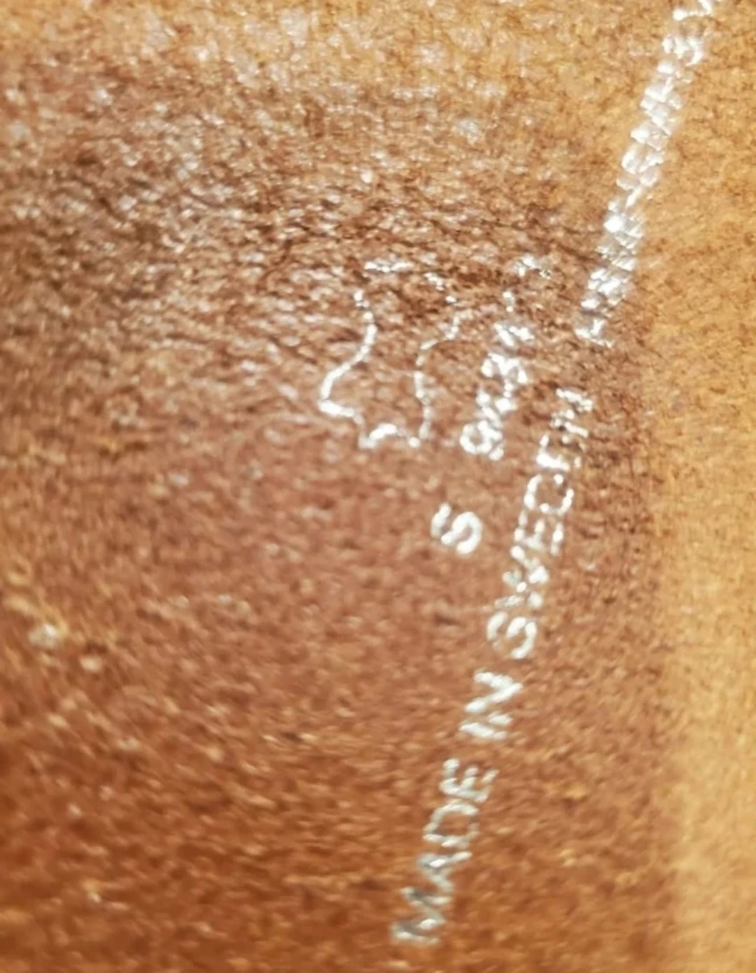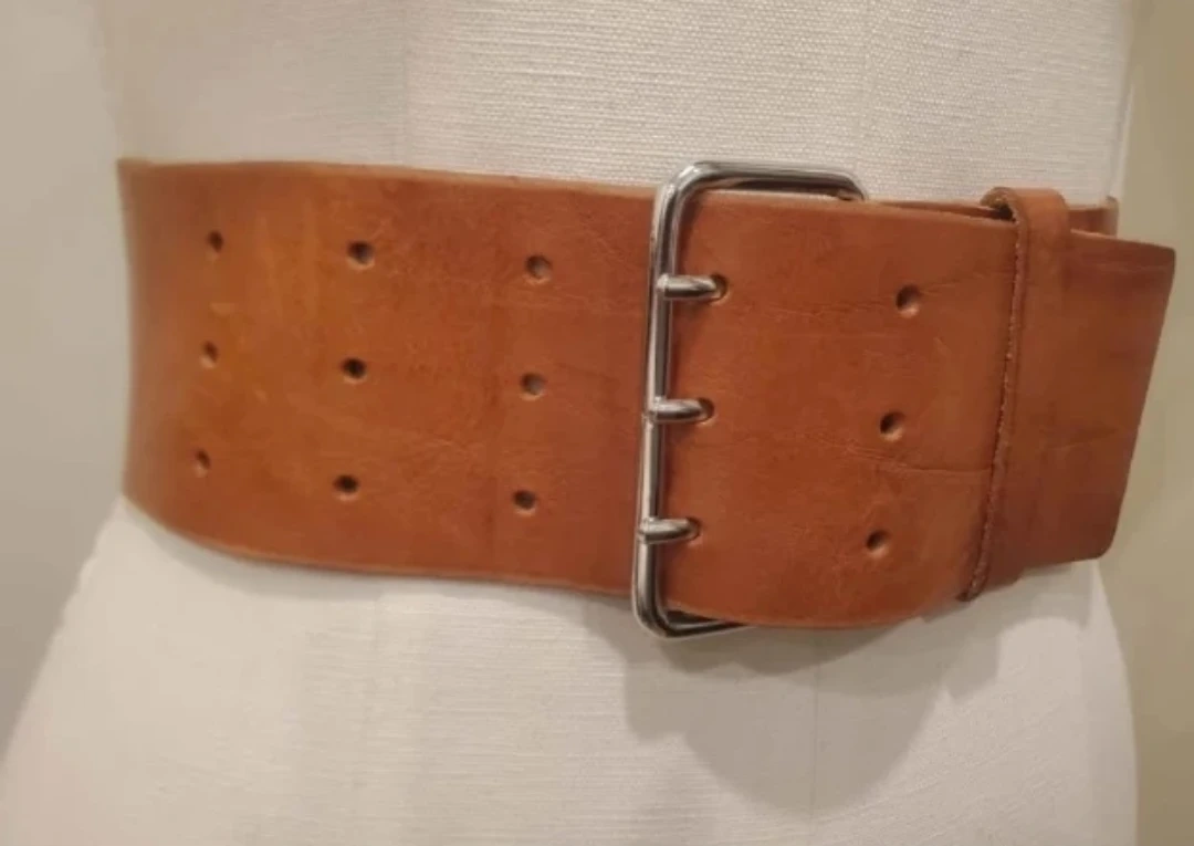 Wide tan leather obi style belt with double buckle closure. Made in Sweden. This belt adds a unique touch to any outfit. It's leather with a fabric backing. Pickup location eglinton and dufferin area