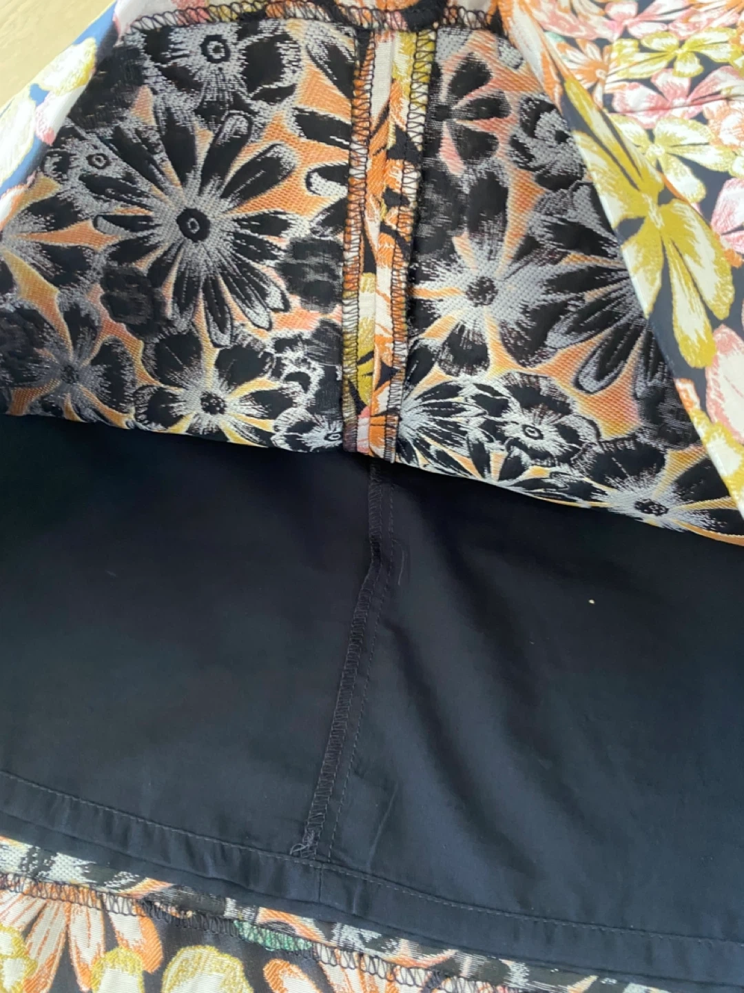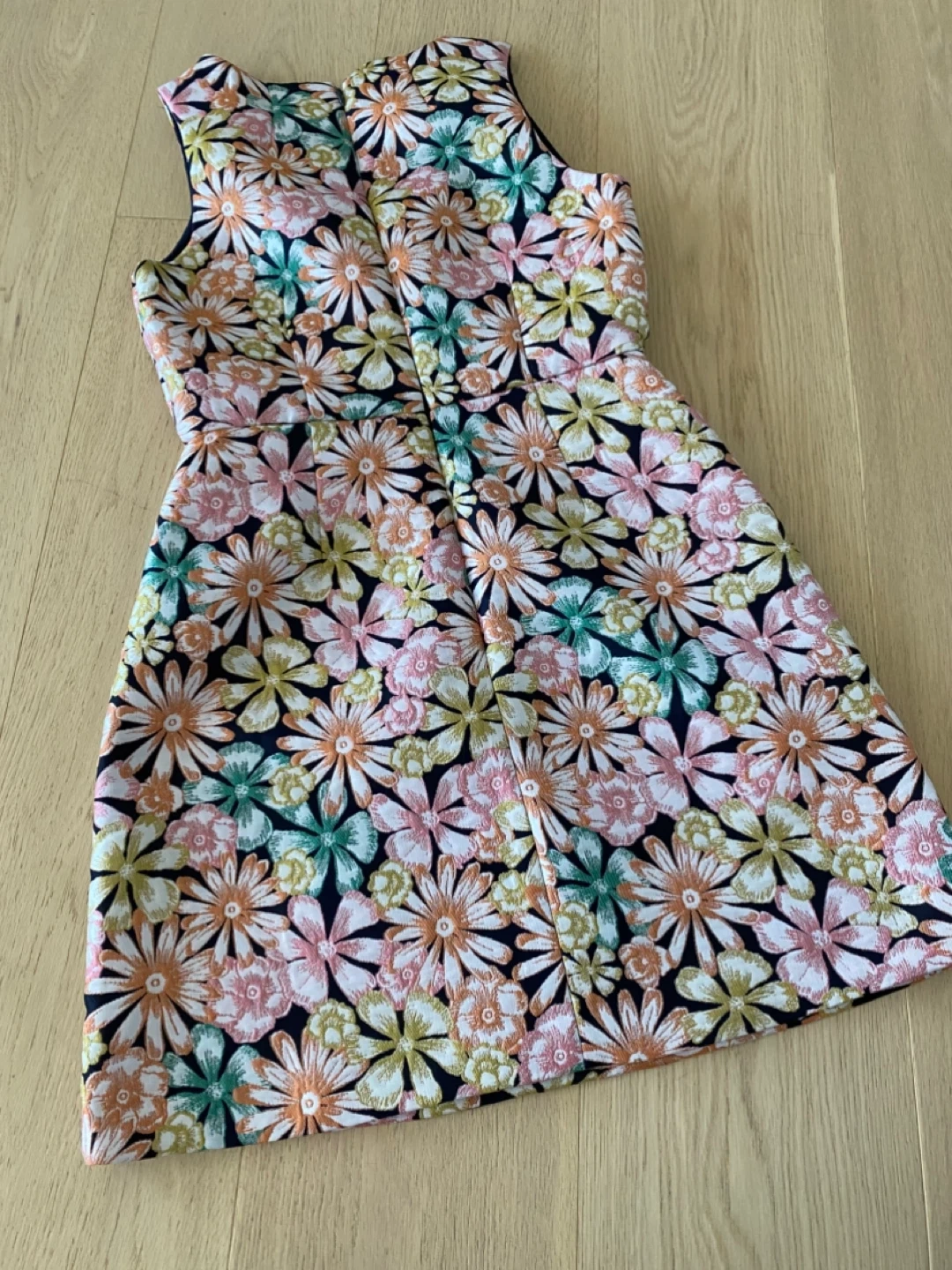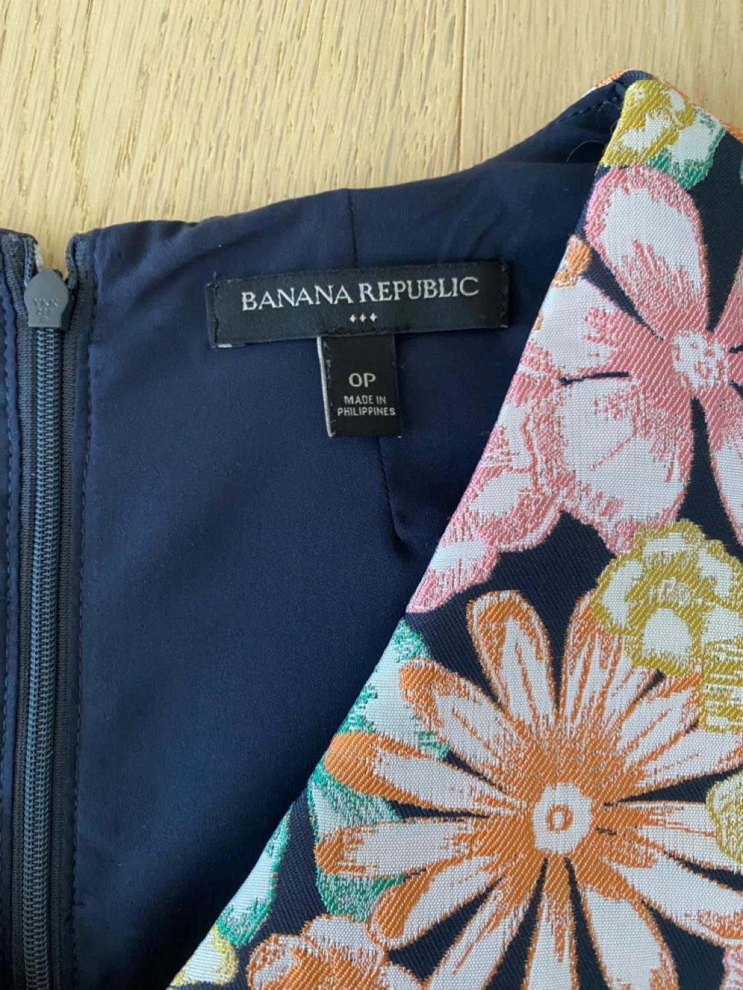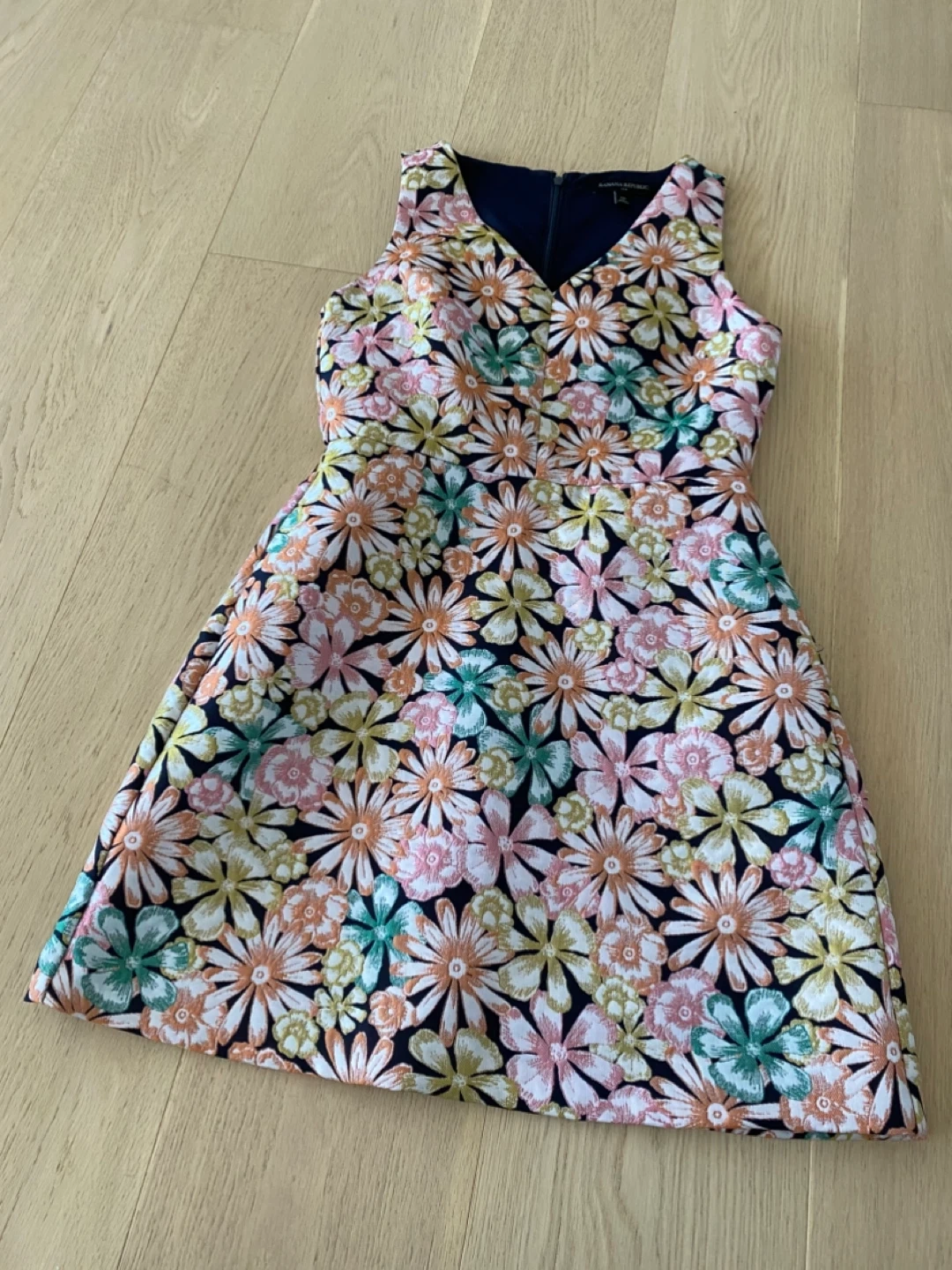 This is a Banana Republic dress in size 0P. It features a colourful floral pattern on a dark navy background. The dress is in great condition and perfect for spring or summer