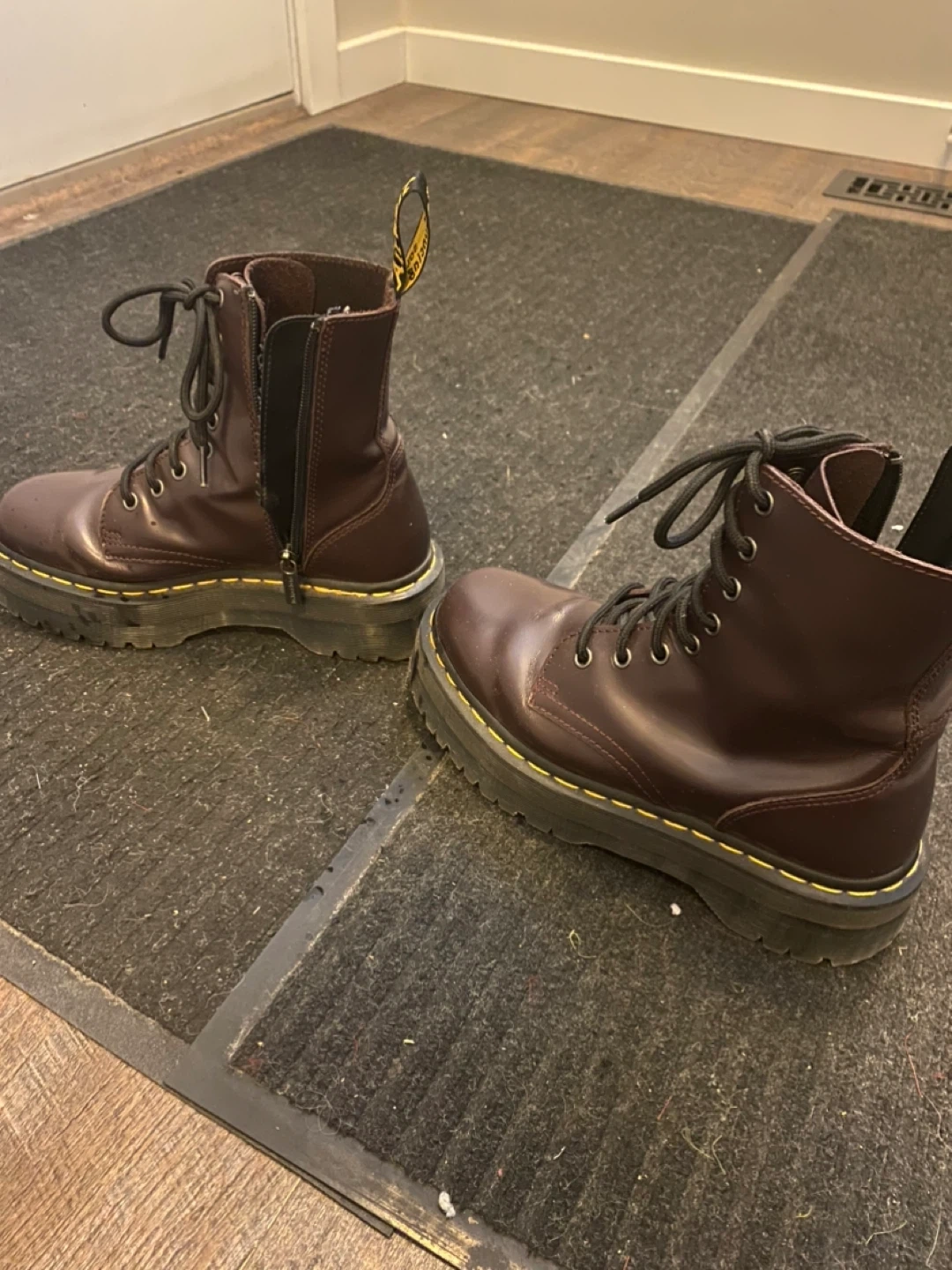 Dr. Martens Jadon platform boots in a deep burgundy colour. These boots feature a side zip for easy wear, in addition to the laces. Built for durable use, barely worn. Slight crease but only selling them because they fit too big on me. Selling for half price!! Also alright with trades! Looking for ankle boot/loafer docs!