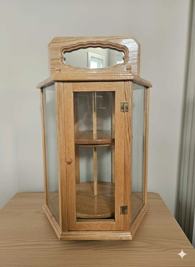 This lovely curio cabinet features a wood frame and glass panels, perfect for displaying your cherished collectibles. It is in used condition. Inside, rotating shelves offer a unique way to showcase your items, making it a delightful addition to any room.