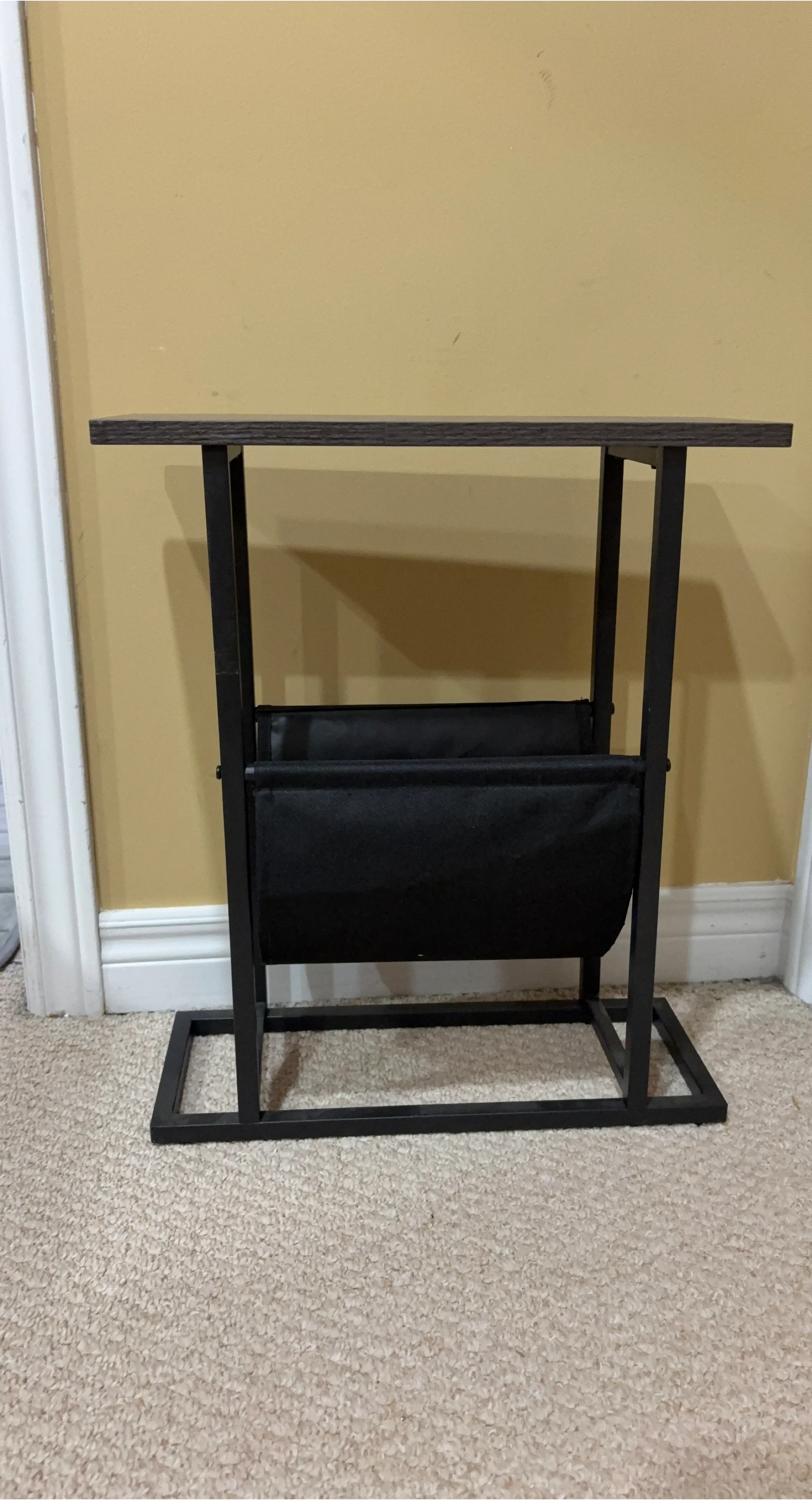 This side table features a dark wood-grain top and a black fabric magazine rack underneath. Its slim design makes it handy for placing beside a sofa or chair. The metal frame offers sturdy support.