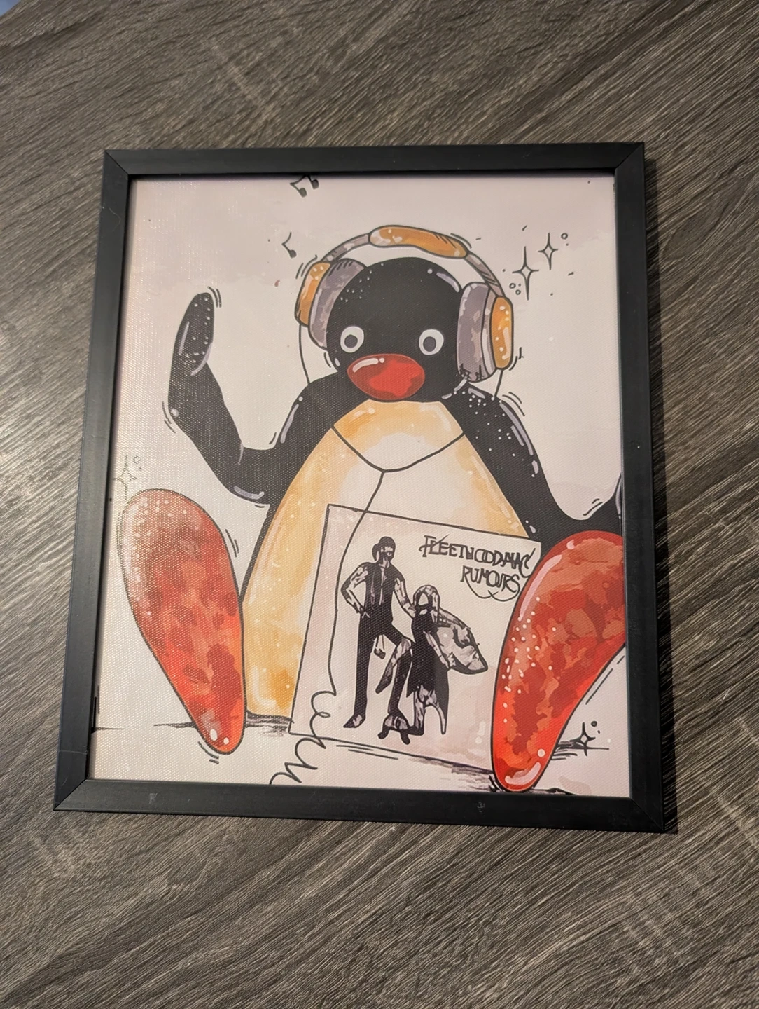 Framed art print featuring Pingu wearing headphones and holding a Fleetwood Mac 'Rumours' album cover. A fun piece for any music or Pingu fan!