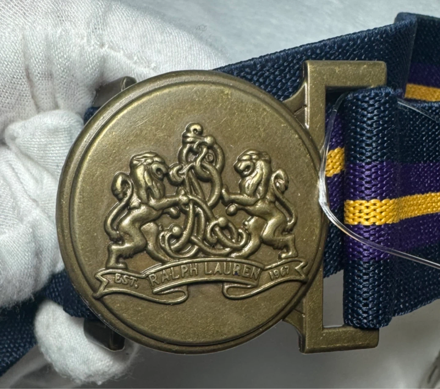 This vintage Ralph Lauren belt features a navy, purple and yellow stripe design.