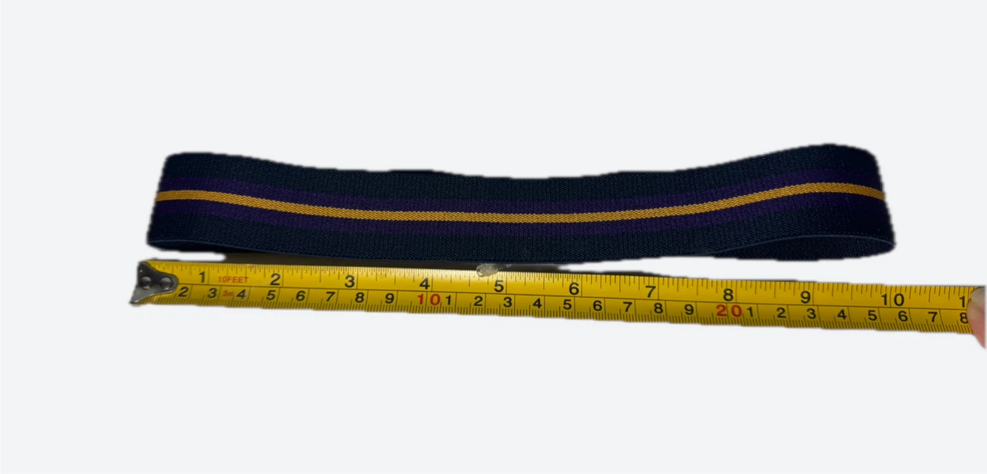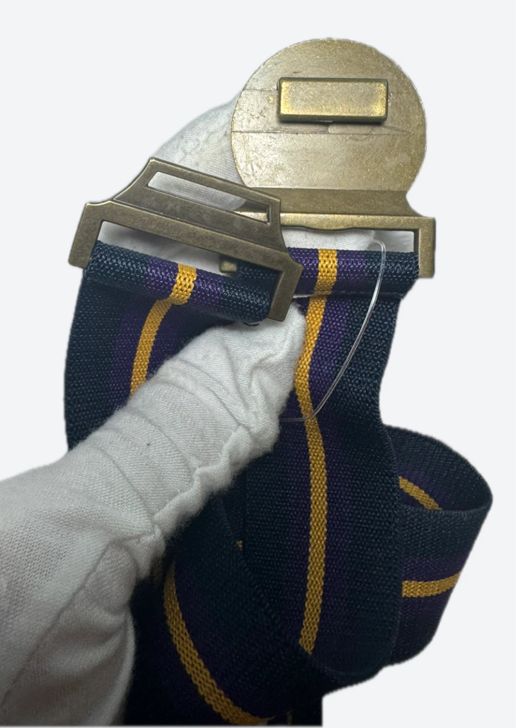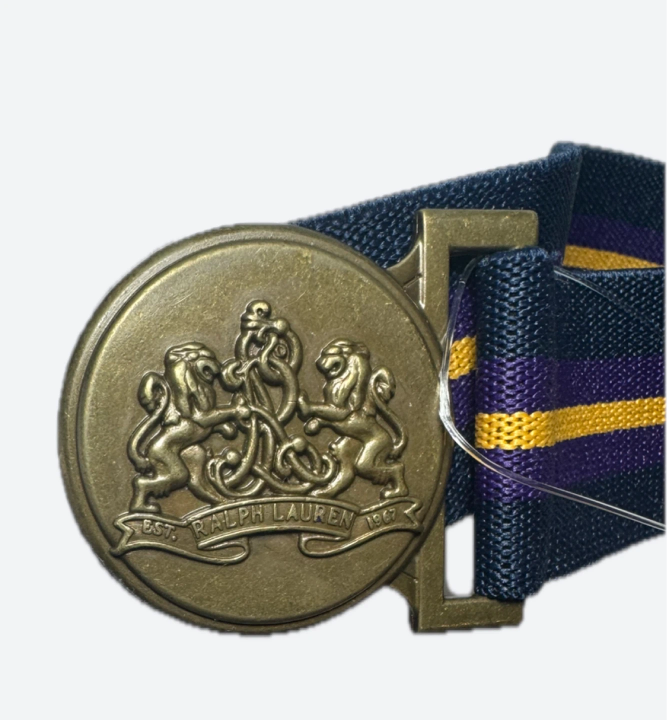 This vintage Ralph Lauren belt features a navy, purple and yellow stripe design.
