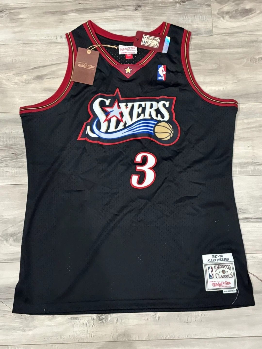 Up for grabs is a Mitchell & Ness Allen Iverson Philadelphia Sixers jersey! This Hardwood Classics jersey is a must-have for any basketball fan. It features Iverson's name and number 3 on the back. A great way to show your love for the game