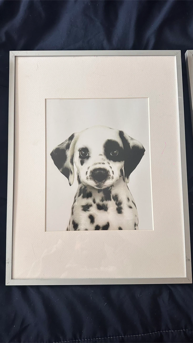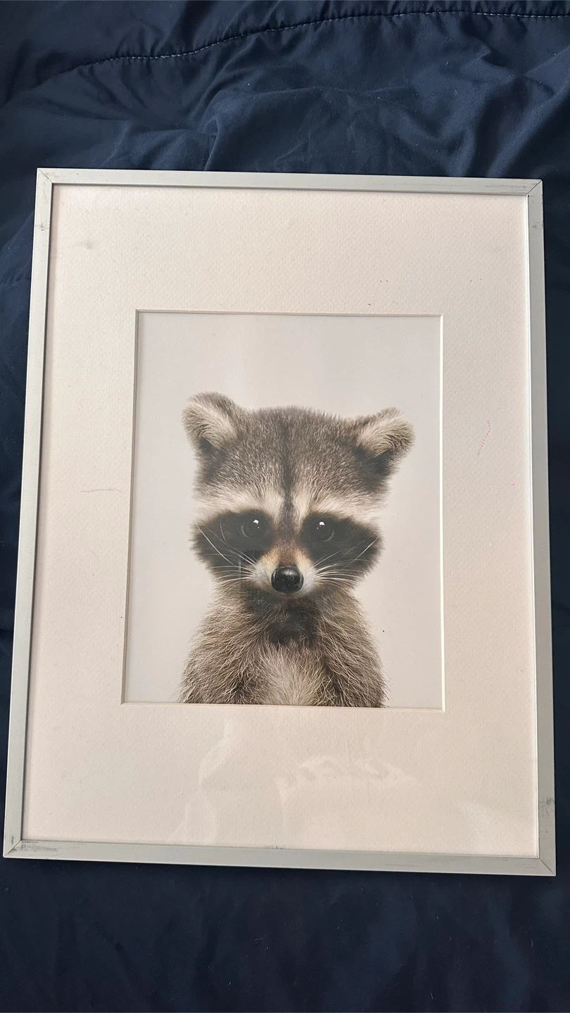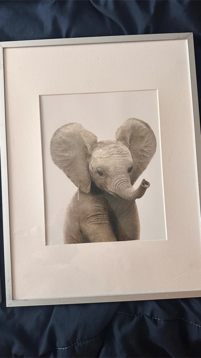 Cute framed prints featuring a baby elephant, raccoon, donkey, and dalmatian. These would look great in a nursery or child's room. Each print has a simple silver-coloured frame.