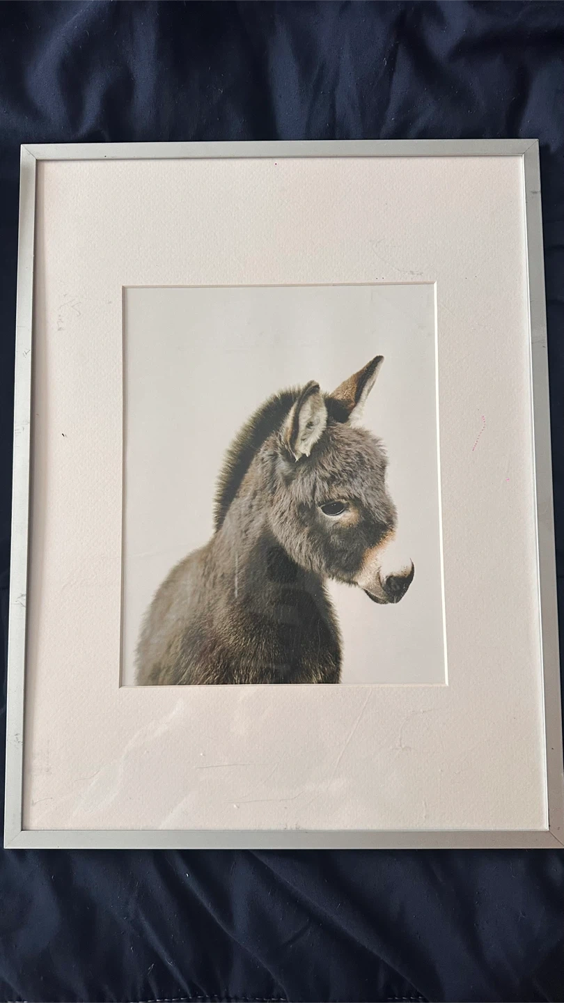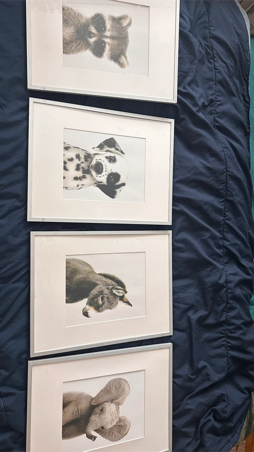 Cute framed prints featuring a baby elephant, raccoon, donkey, and dalmatian. These would look great in a nursery or child's room. Each print has a simple silver-coloured frame.