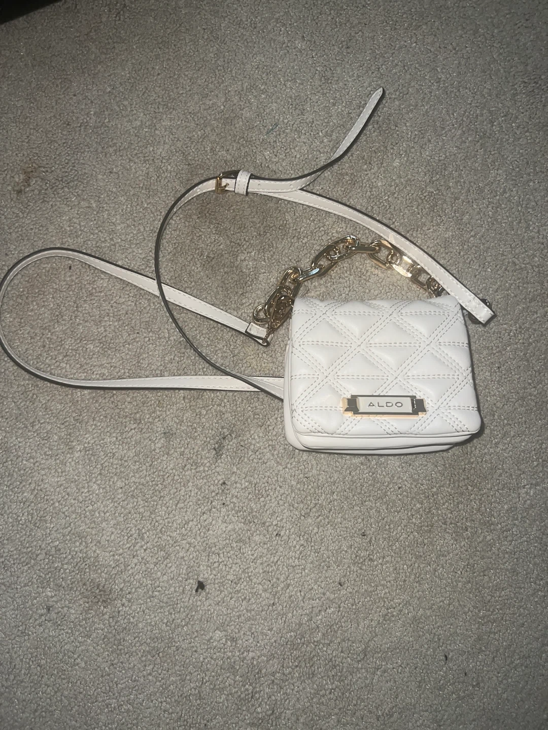 Quilted white crossbody bag from ALDO. It features a gold chain accent and a long adjustable strap. Small size, perfect for essentials.