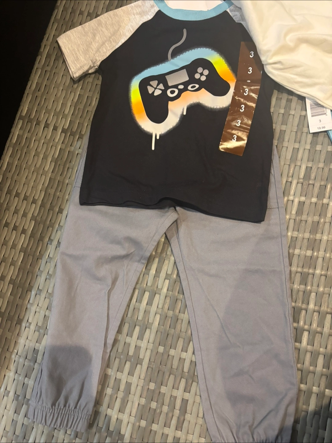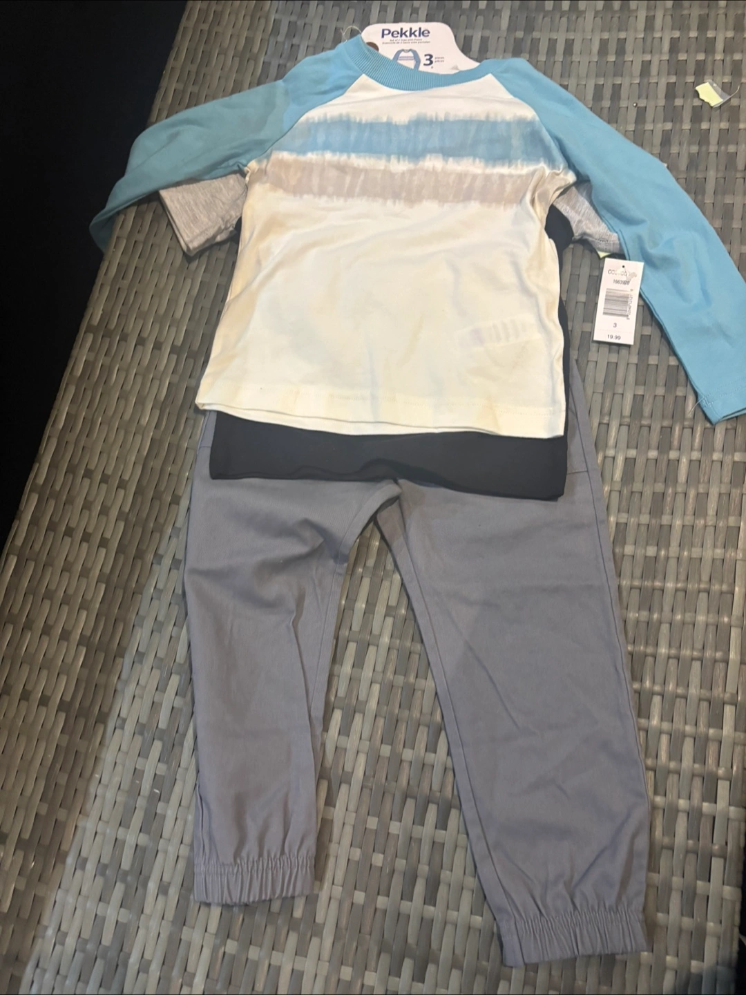 This Pekkle set includes two tops and one pair of pants. One top features a graphic print and the other has a tie-dye design. The pants are a solid grey colour with an elastic waistband.