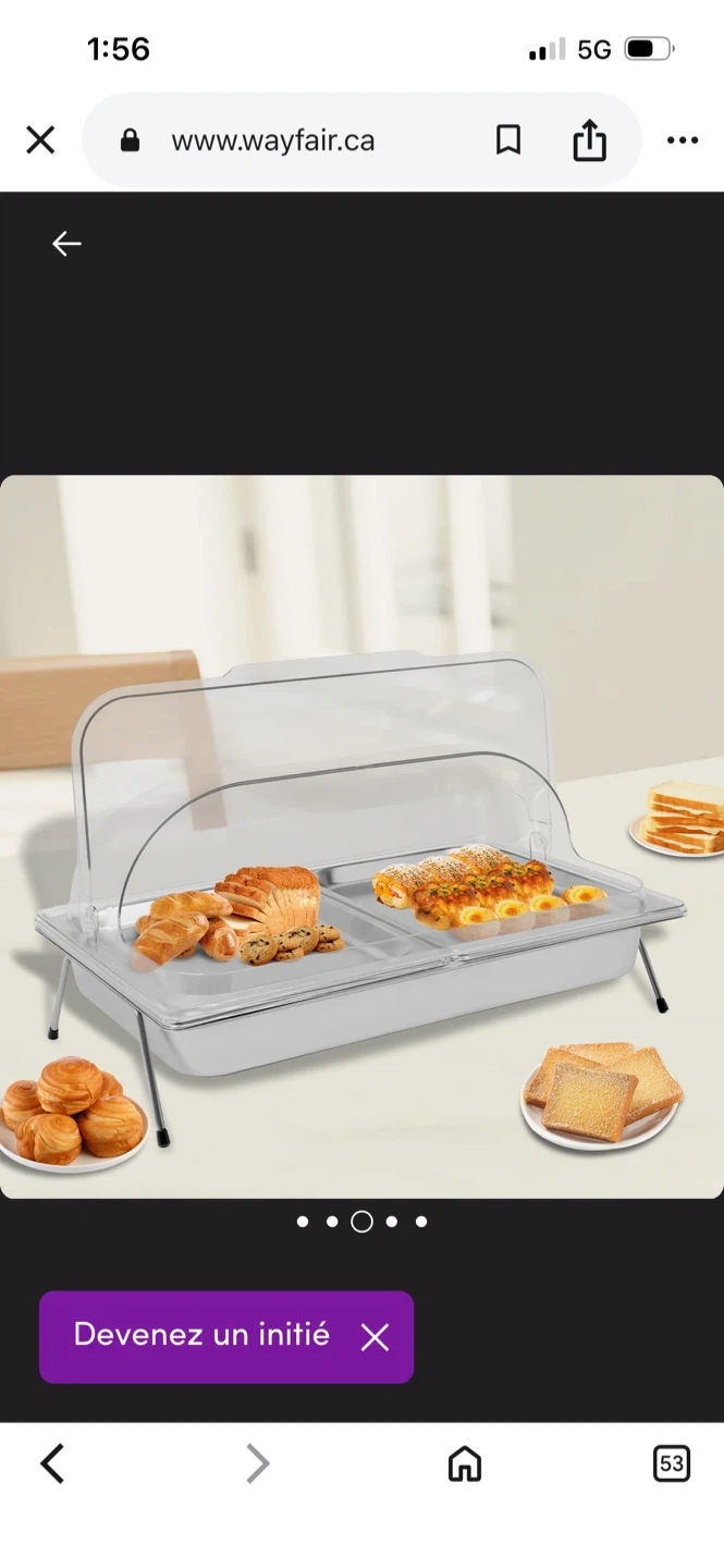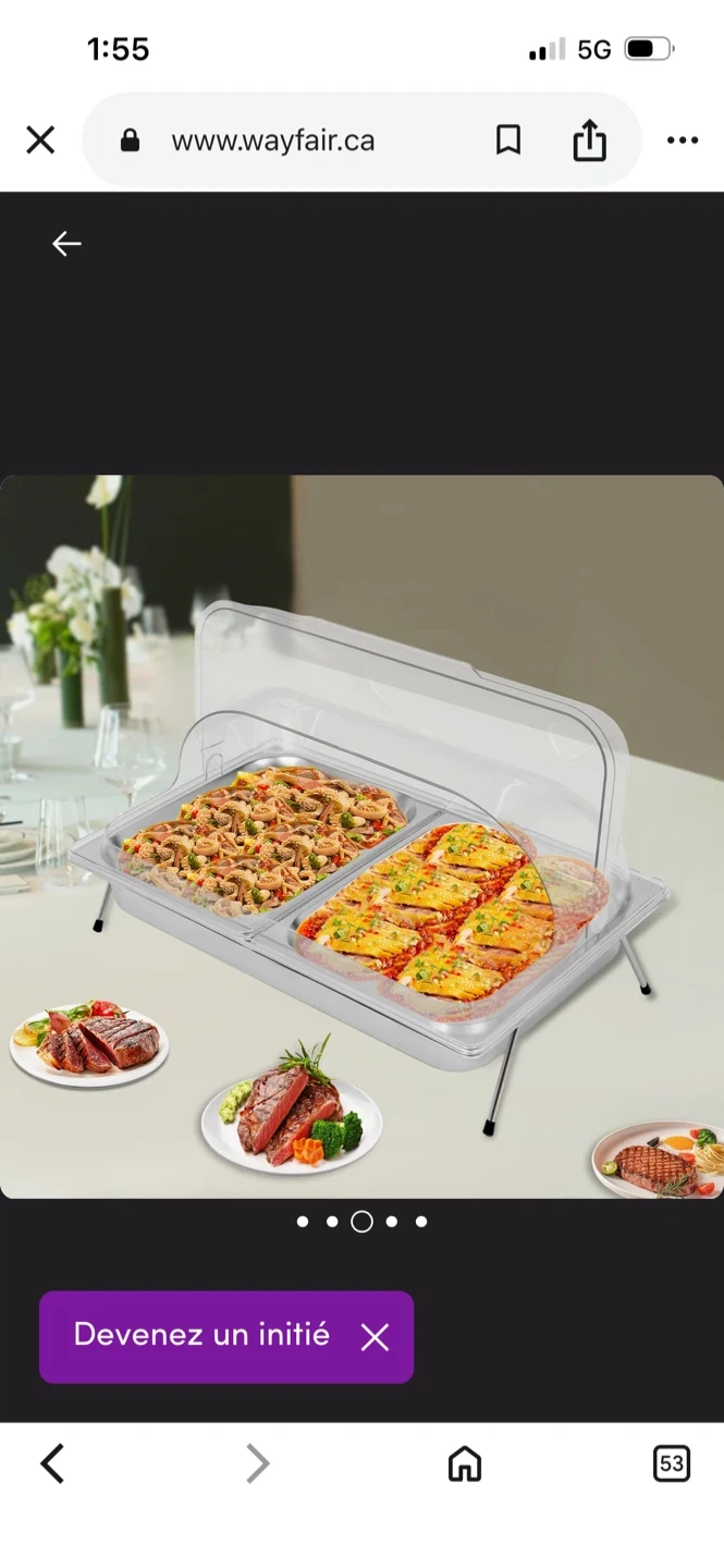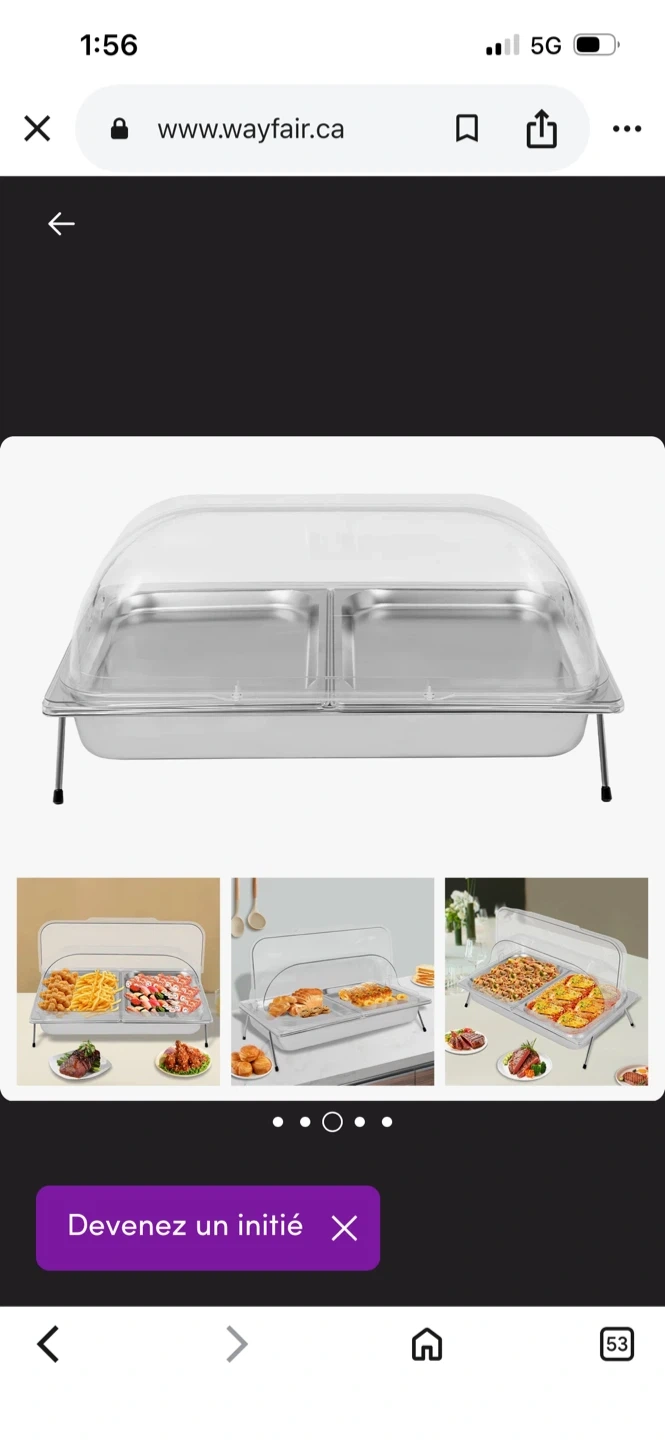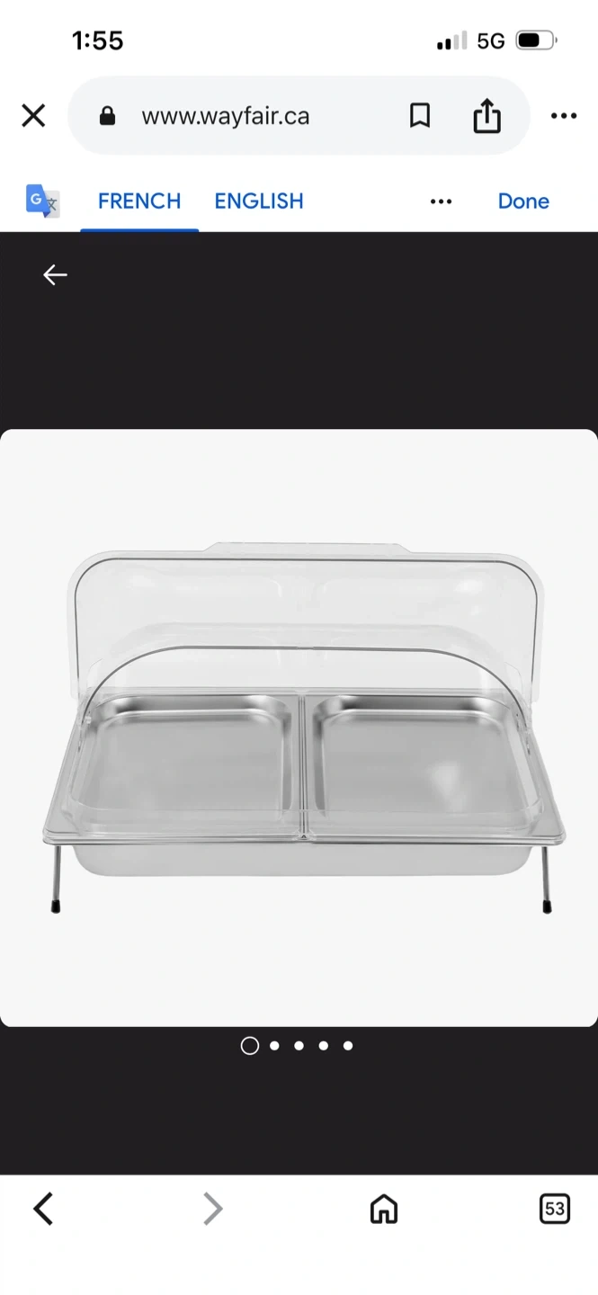 Stainless steel chafing dish with two rectangular compartments. It includes a clear lid that props open. Stands on two foldable legs.