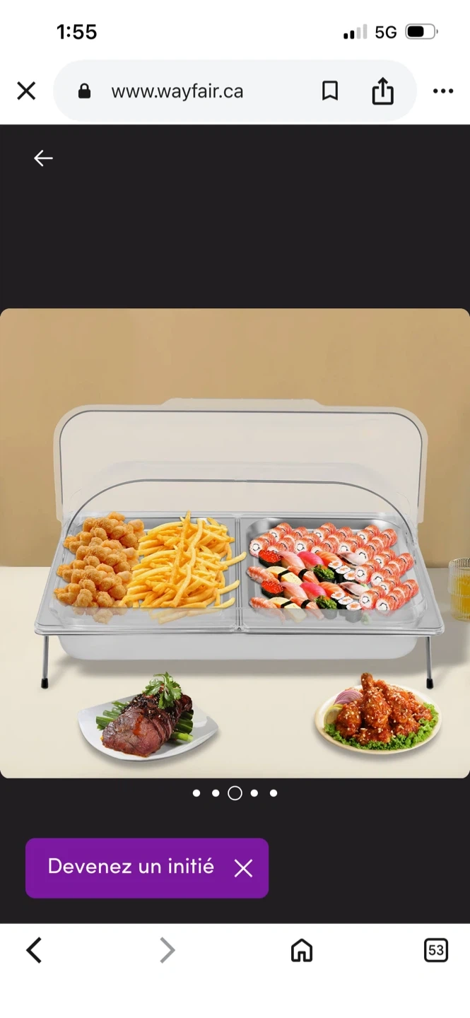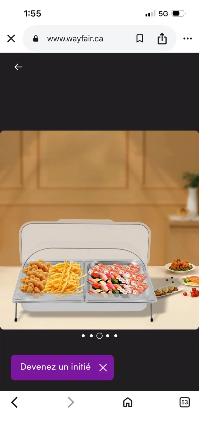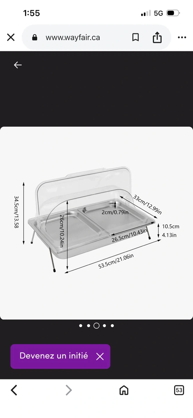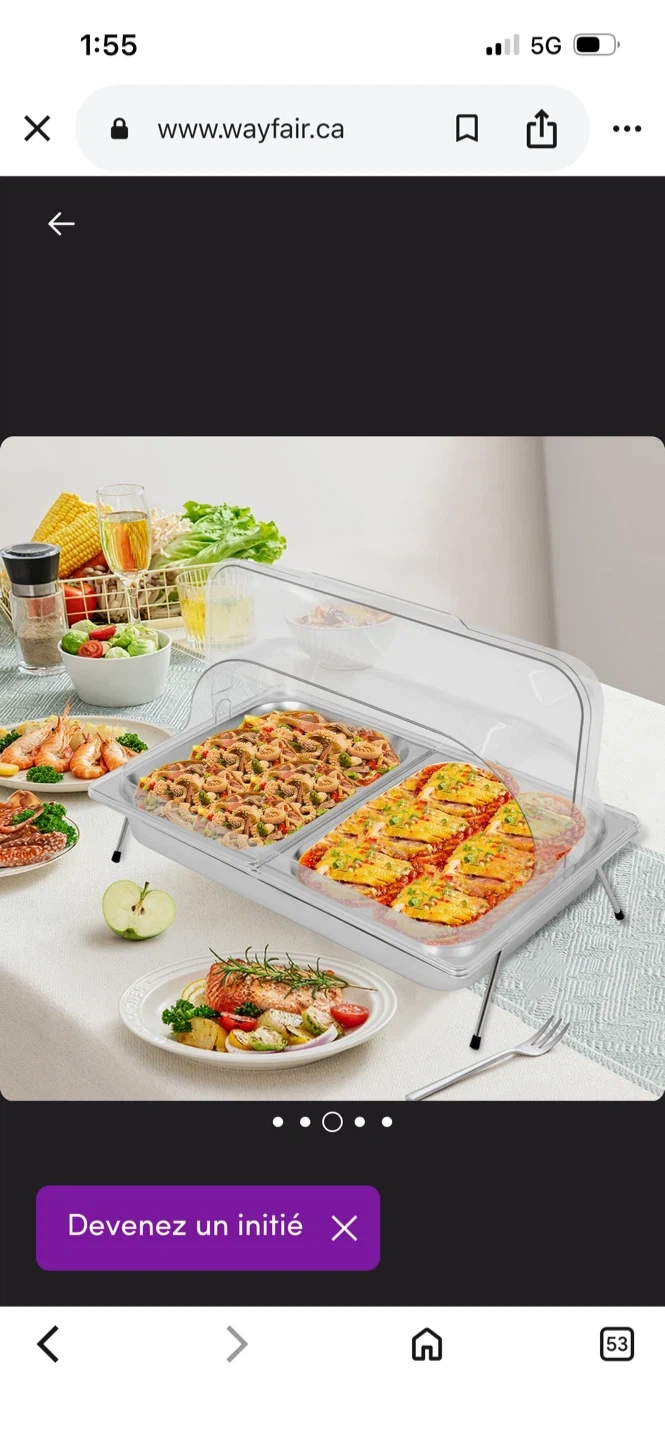 Stainless steel chafing dish with two rectangular compartments. It includes a clear lid that props open. Stands on two foldable legs.