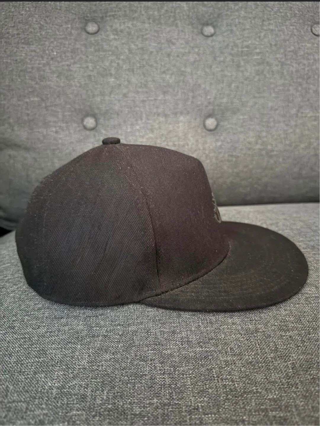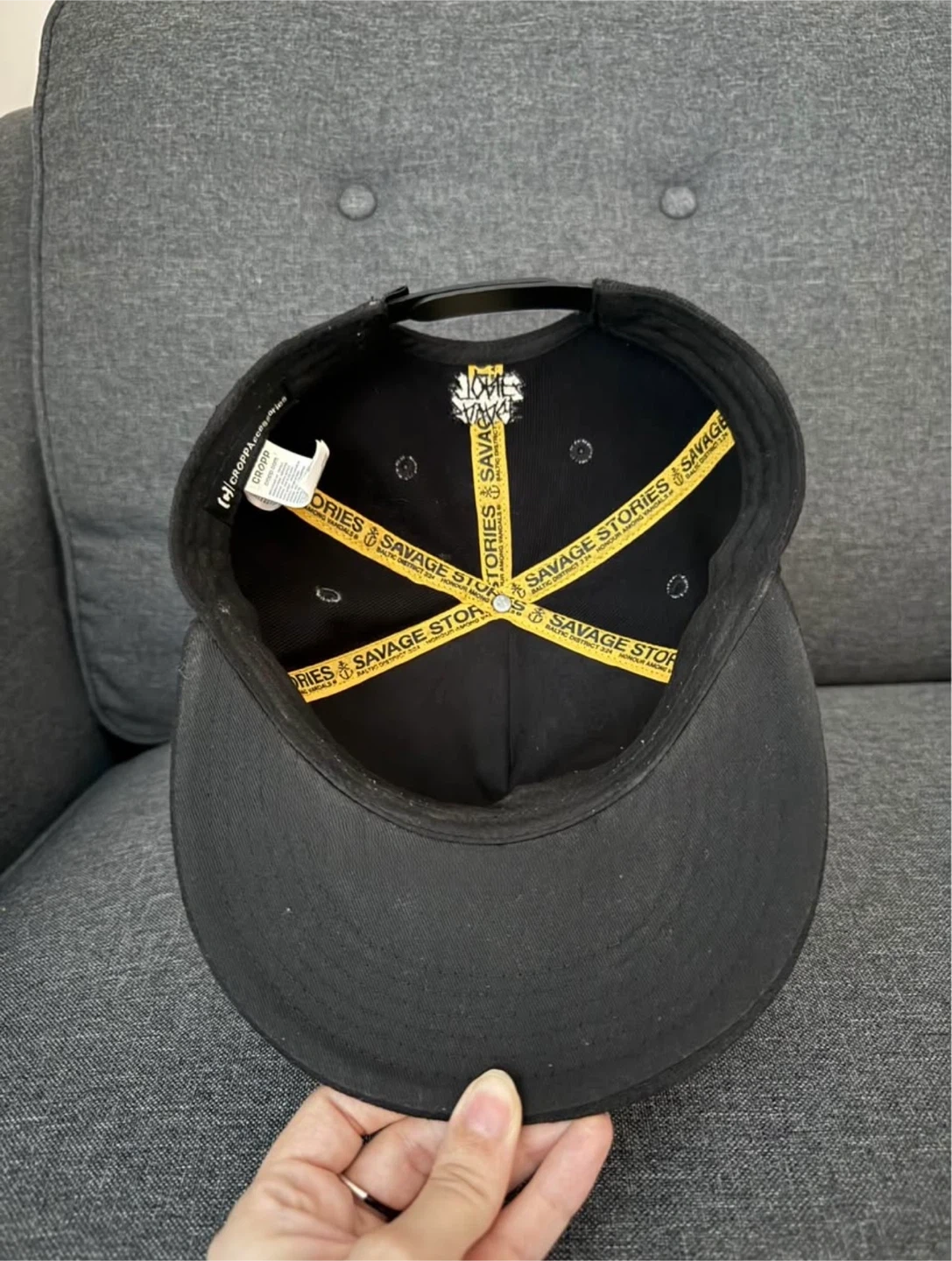 A black baseball cap from Savage Stories. It has an embroidered anchor logo on the front. The inside band has "Savage Stories" printed on it.