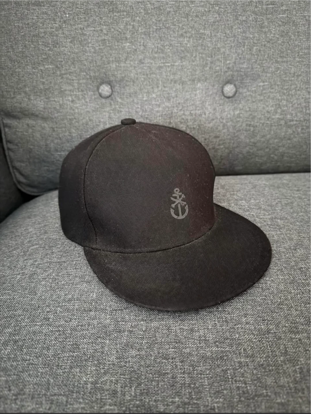 A black baseball cap from Savage Stories. It has an embroidered anchor logo on the front. The inside band has "Savage Stories" printed on it.