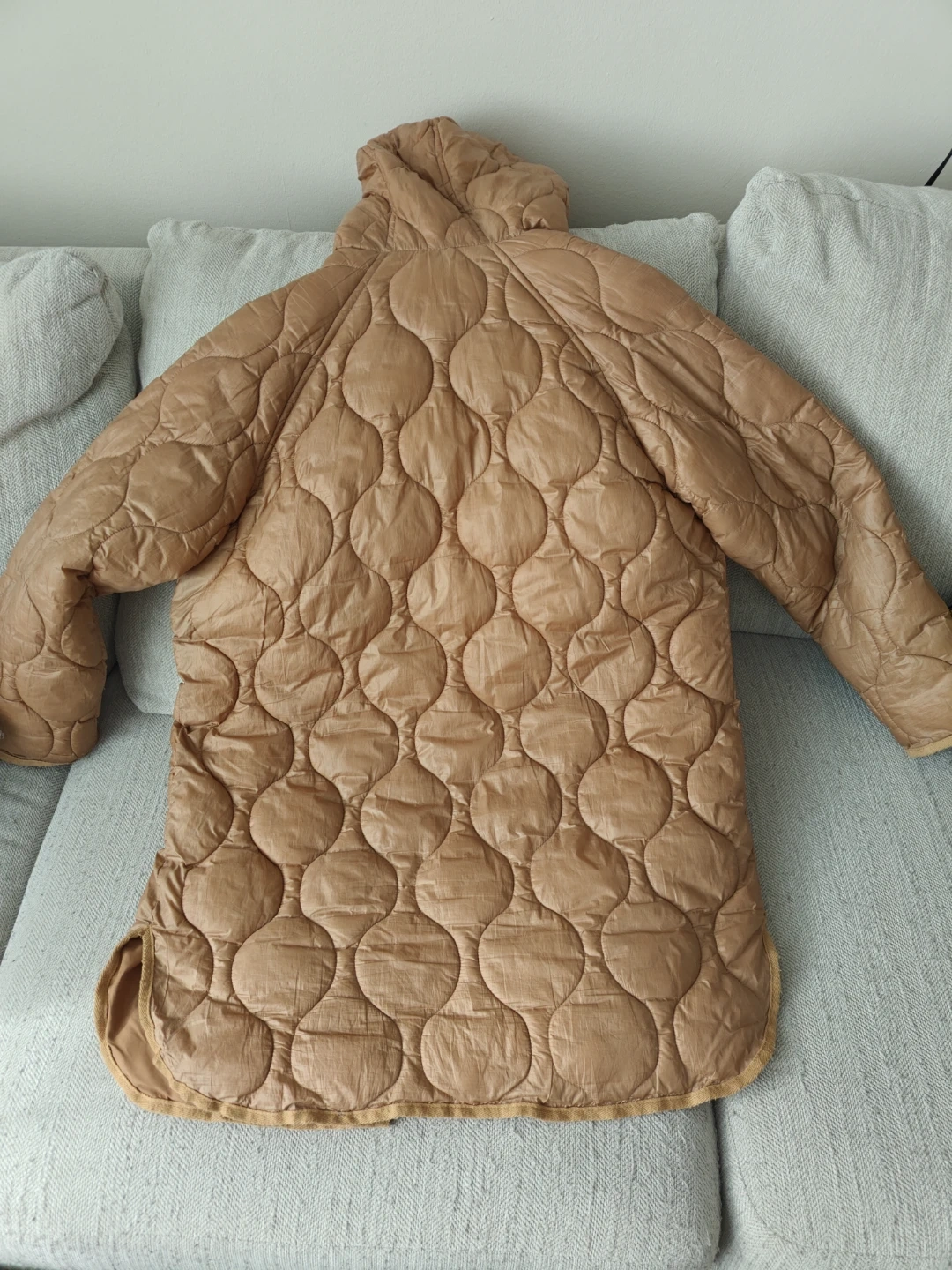 Tan quilted jacket from Zara. It's a size 11-12 years, which is CM 152. It has a zip-up front with snap buttons, two front pockets, and a zippered chest pocket. It's great for keeping warm during cooler weather!