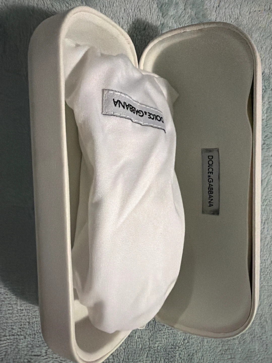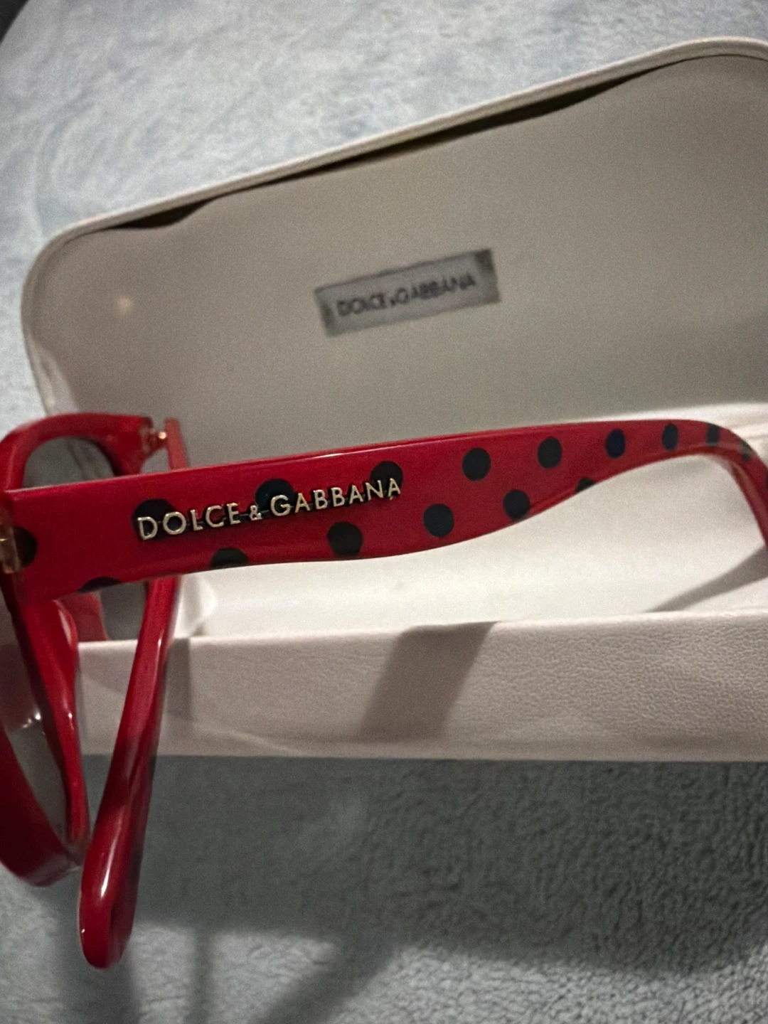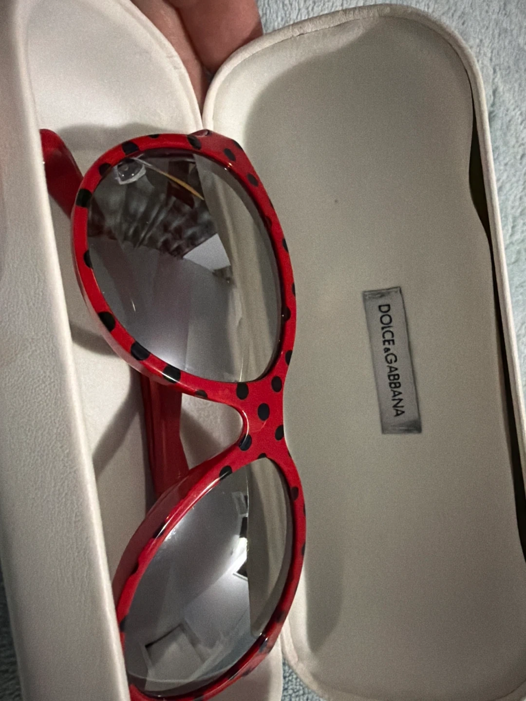 These Dolce & Gabbana sunglasses feature a vibrant red frame with a classic black polka dot pattern. They come with their original hard case and a soft cleaning cloth, both branded with Dolce & Gabbana. Stylish accessory for sunny days!