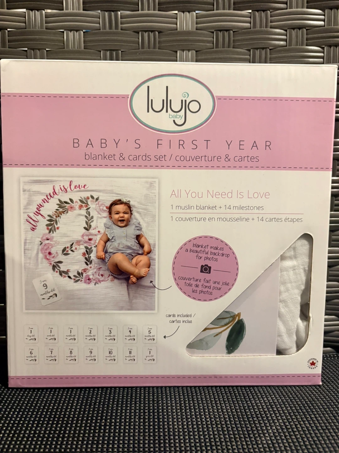 This Lulujo 'All You Need Is Love' set includes one muslin blanket and 14 milestone cards. The blanket's design makes it a beautiful backdrop for photos. Use it to capture your baby's growth through their first year!