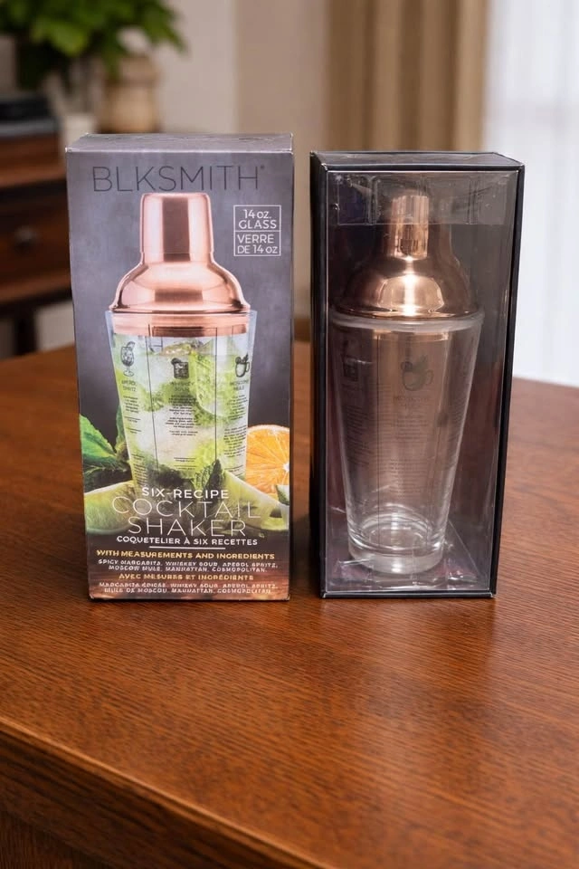 Brand new, never opened BLKSMITH cocktail shaker set. Includes 14 oz glass with 6 printed cocktail recipes and measurements. Perfect as a gift or for a home bar setup. Still sealed in original packaging.