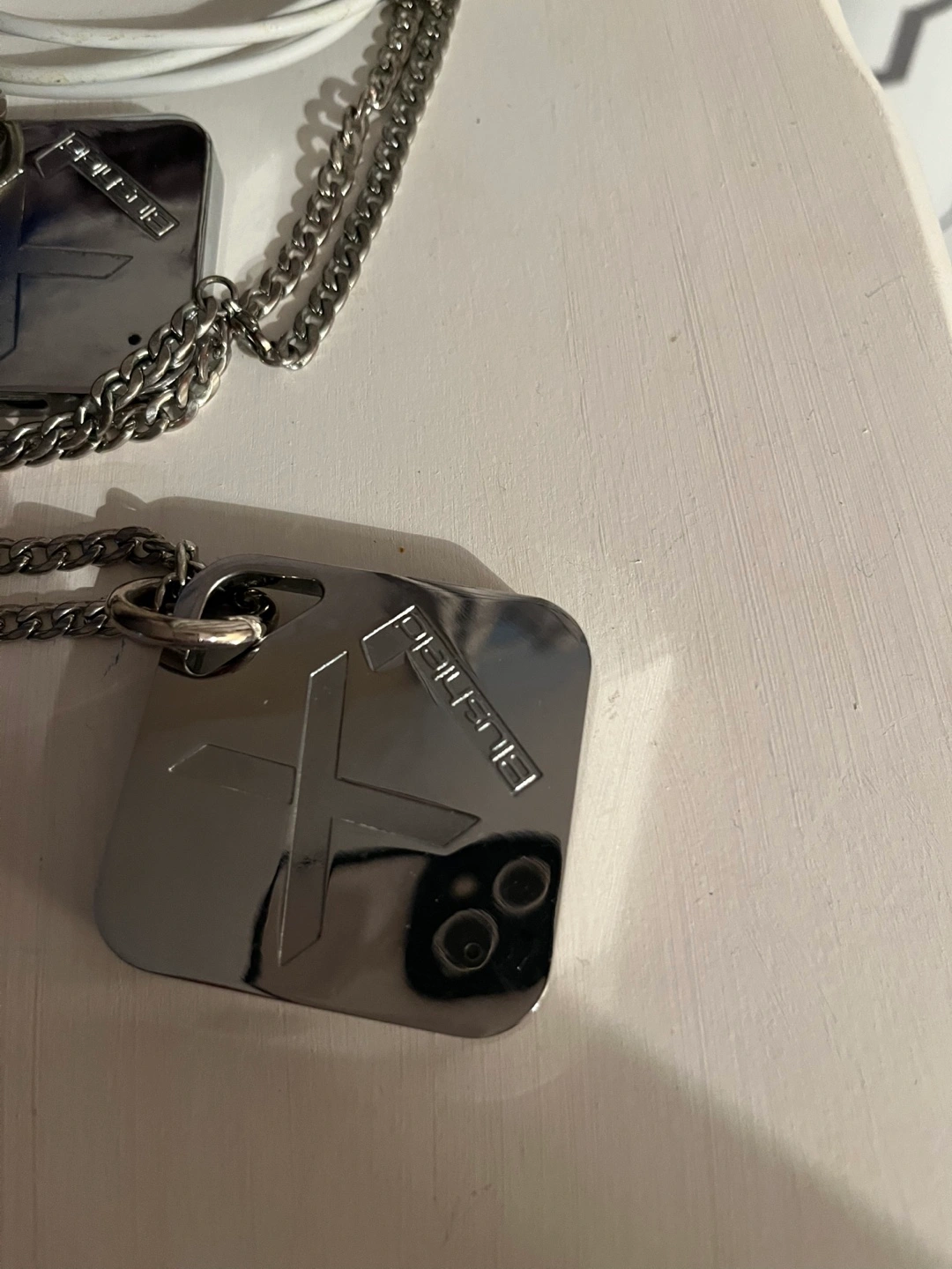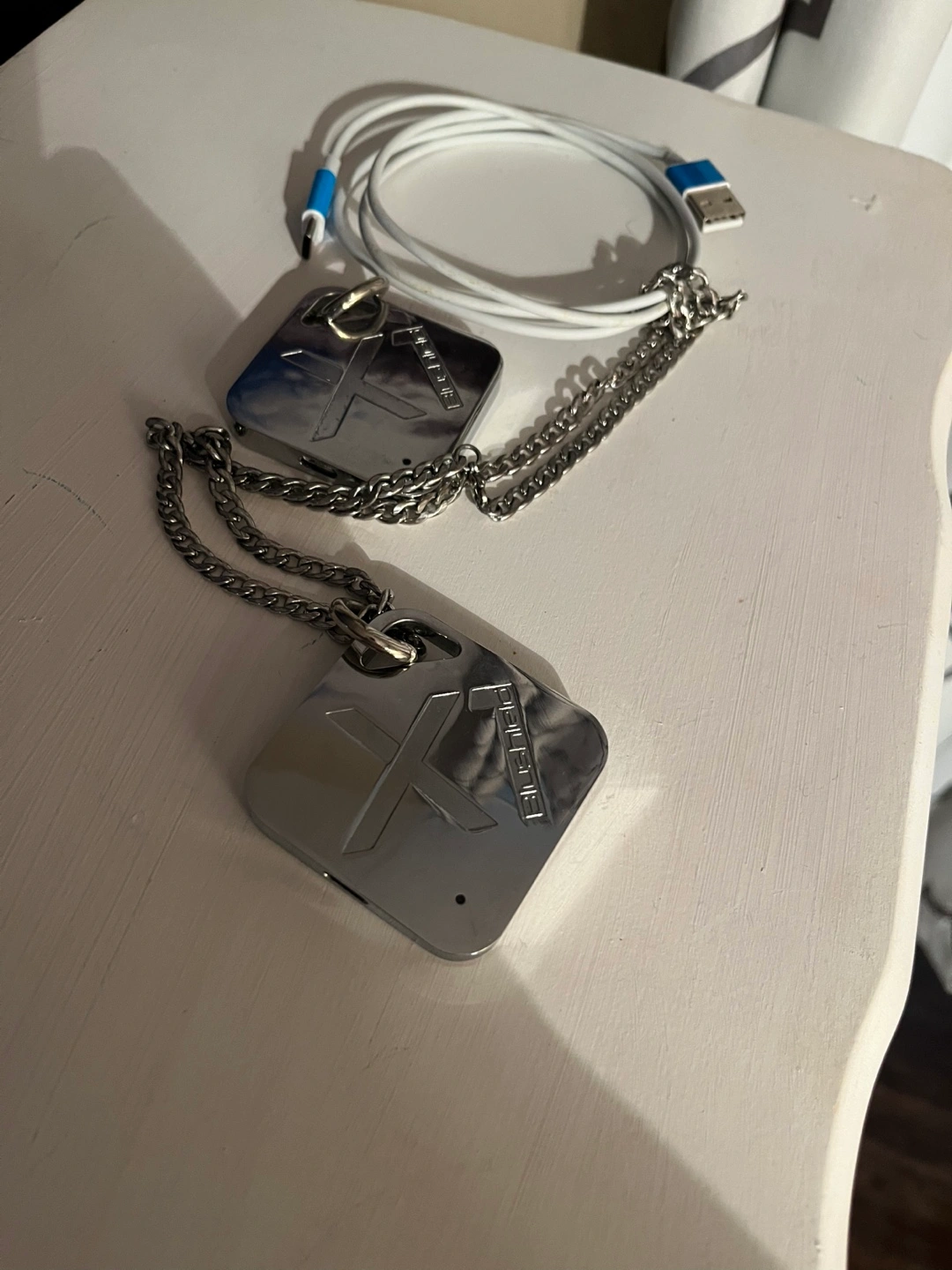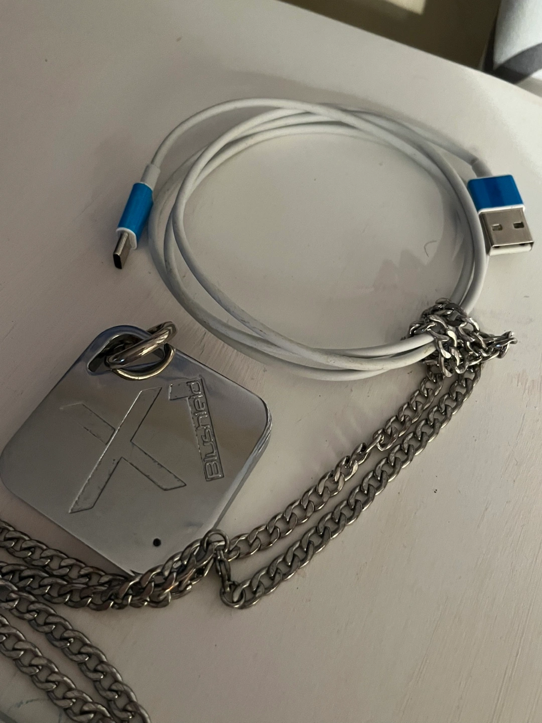 Two Blushild Keychain Trackers with chains, one charging cable, and two keyrings. Necklace, keychain and charging cable.