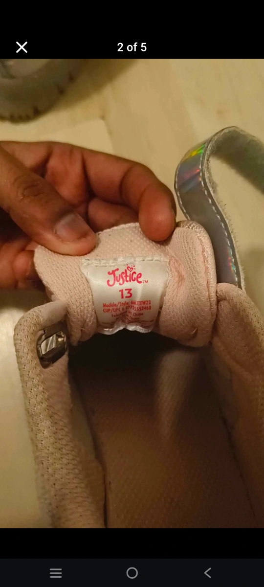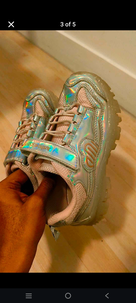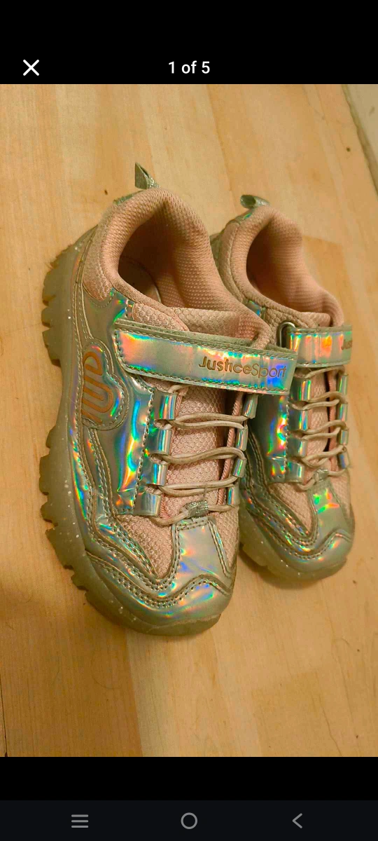 Cute iridescent pink and silver sneakers. Velcro straps and light-up soles. Great for active play. Size 13.