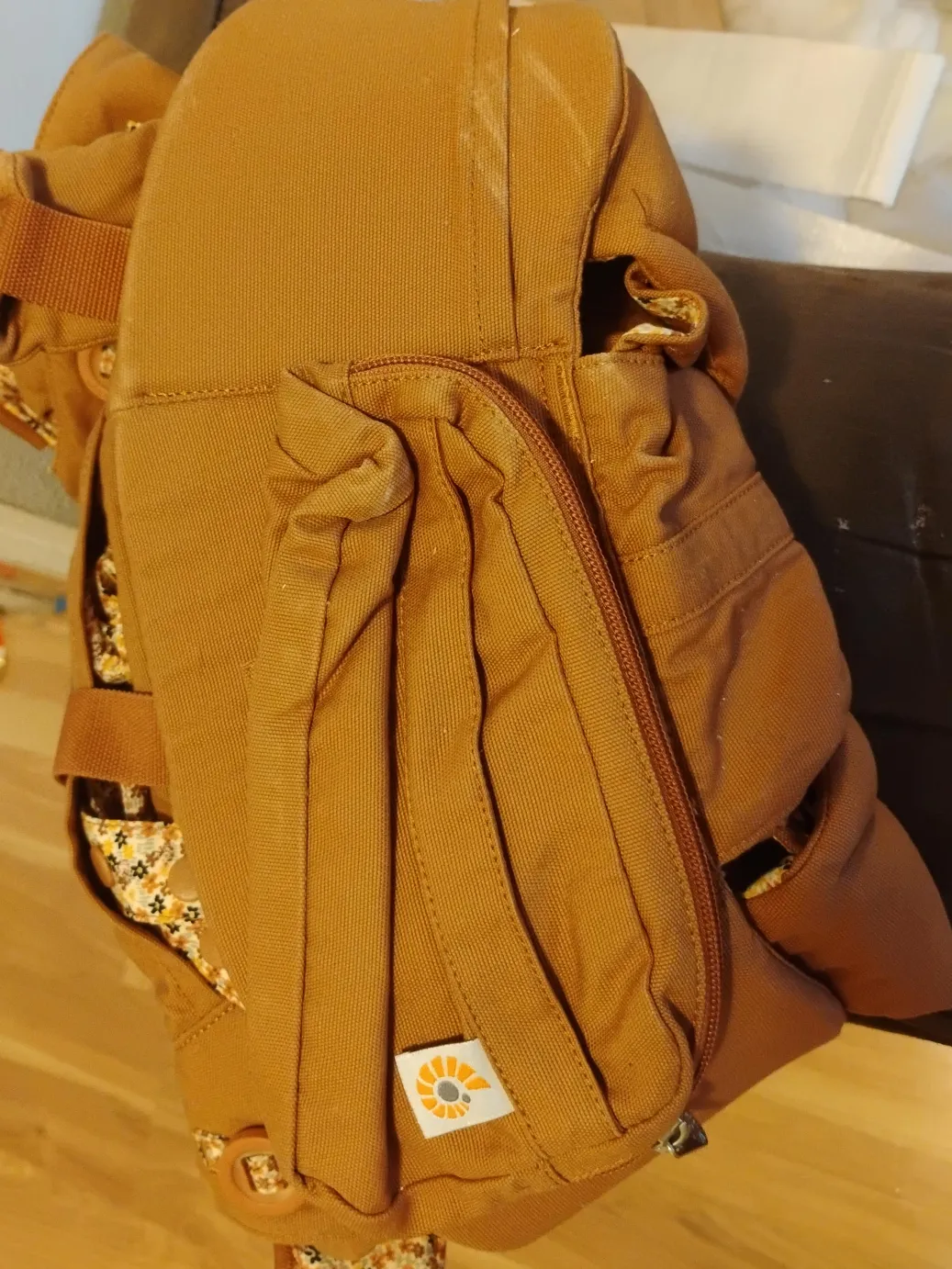 Selling a gently used Ergobaby baby carrier in brown. It's in good condition and ready for a new home! The carrier features a convenient zippered pocket and a comfortable design for both you and your little one. Perfect for keeping your baby close while you're on the go